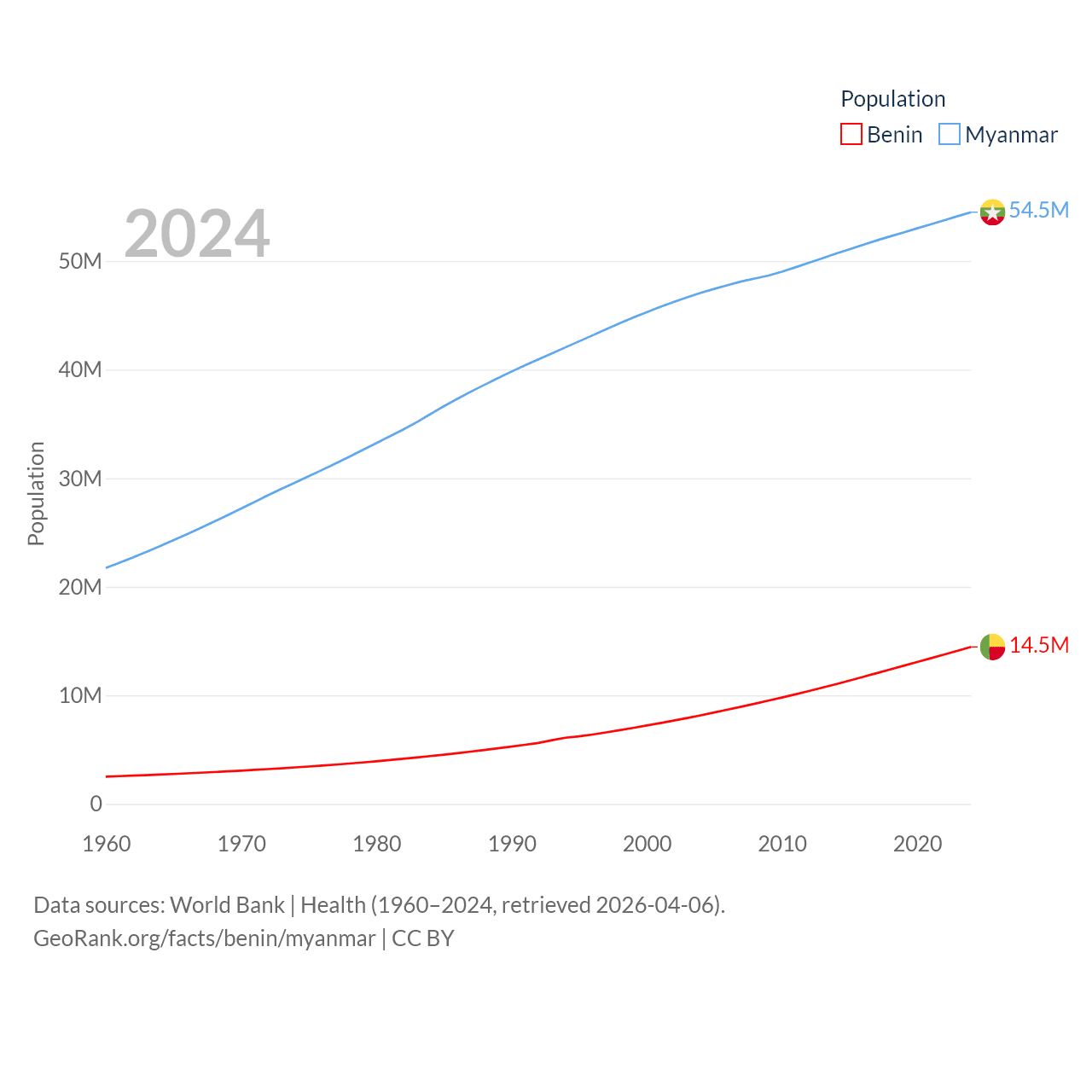 Benin has a population of 14.5M (ranked 76/197), compared with 54.5M in Myanmar (ranked 27/197). Benin's land area is 43,537 sq mi versus 251,997 sq mi for Myanmar (ranked 99th vs. 39th).