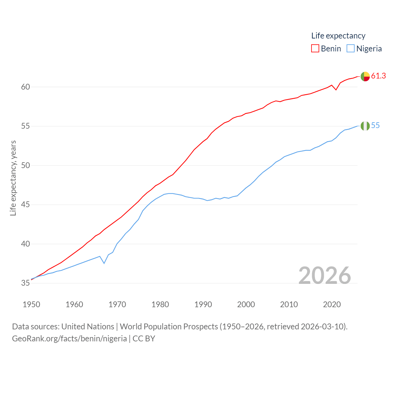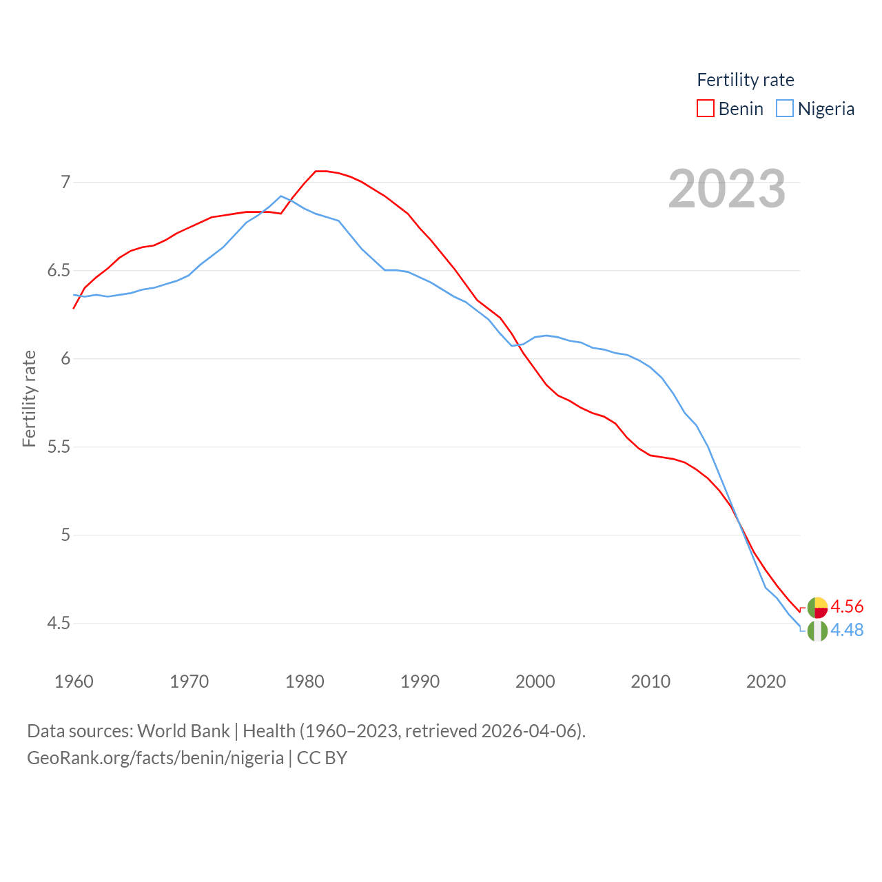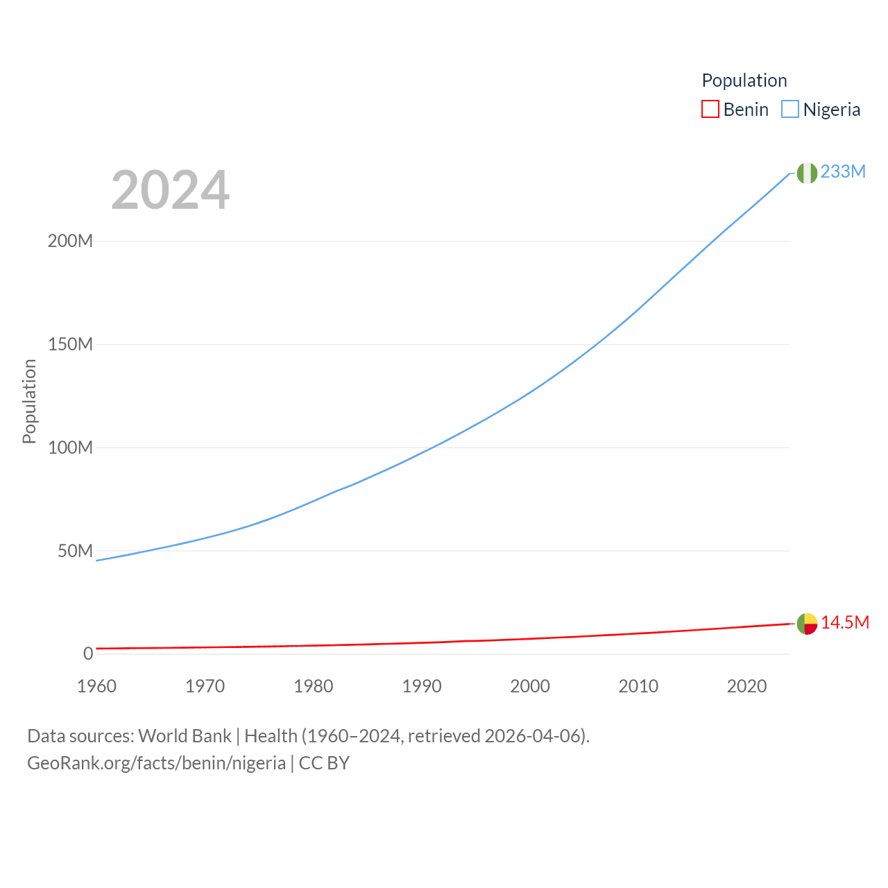 Benin has a population of 14.5M (ranked 76/197), compared with 233M in Nigeria (ranked 6/197). Benin's land area is 43,537 sq mi versus 351,650 sq mi for Nigeria (ranked 99th vs. 30th).