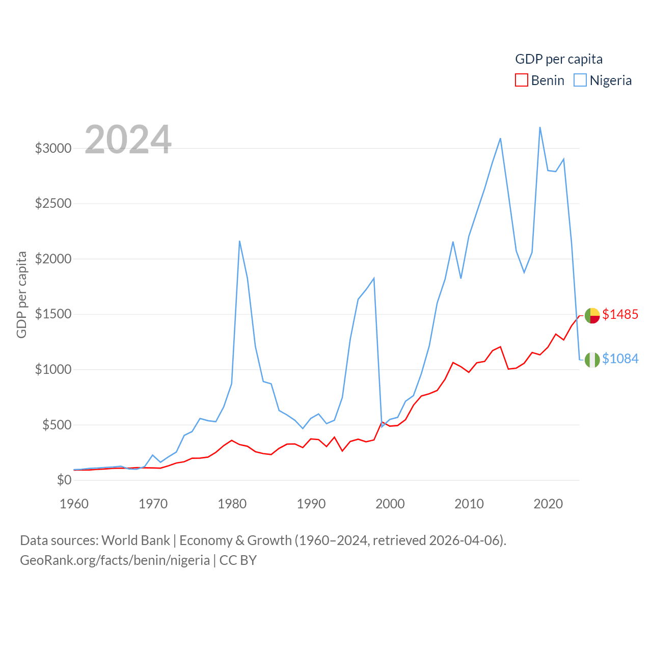 By GDP, Benin ranks 126/197 ($21.5B) and Nigeria ranks 54/197 ($252B). By GDP per capita, Benin ranks 162/197 ($1,485), while Nigeria ranks 174/197 ($1,084).