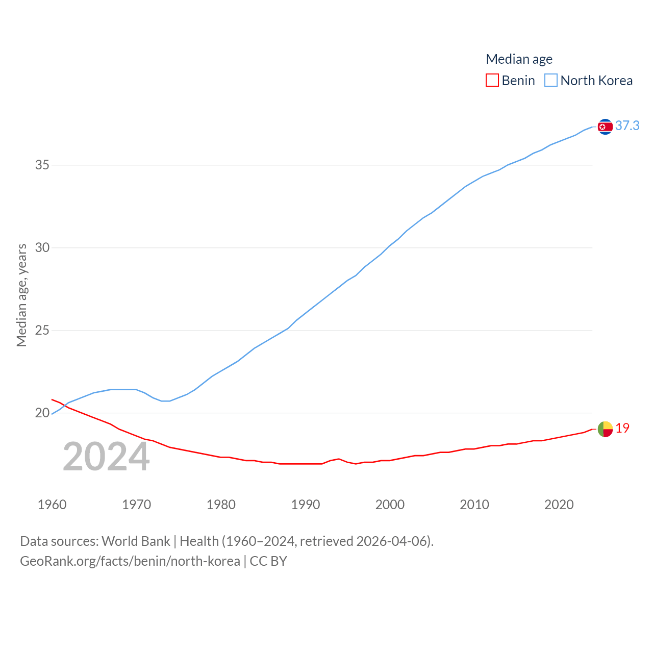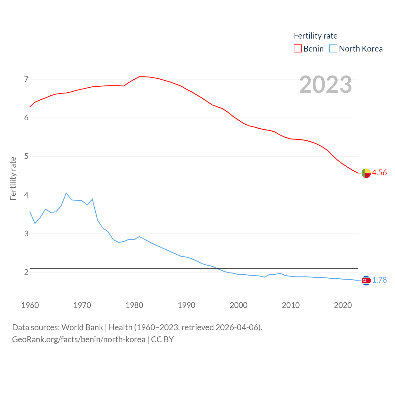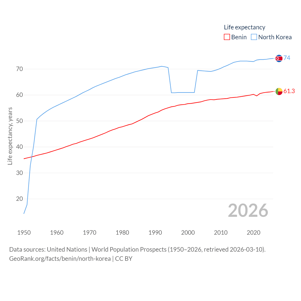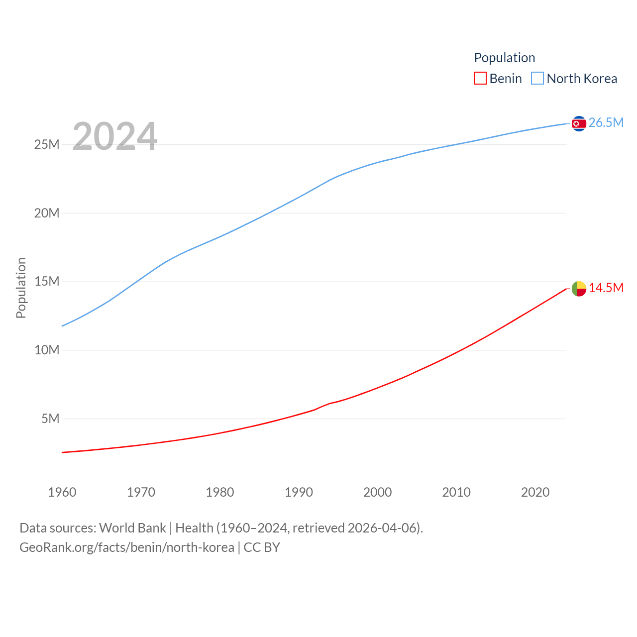 Benin has a population of 14.5M (ranked 76/197), compared with 26.5M in North Korea (ranked 56/197). Benin's land area is 43,537 sq mi versus 46,491 sq mi for North Korea (ranked 99th vs. 97th).