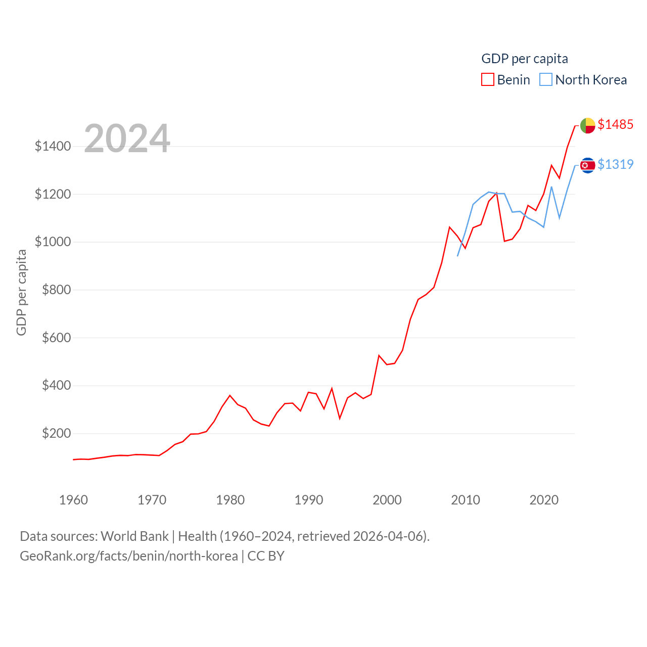 By GDP, Benin ranks 126/197 ($21.5B) and North Korea ranks 106/197 ($34.9B). By GDP per capita, Benin ranks 162/197 ($1,485), while North Korea ranks 168/197 ($1,319).
