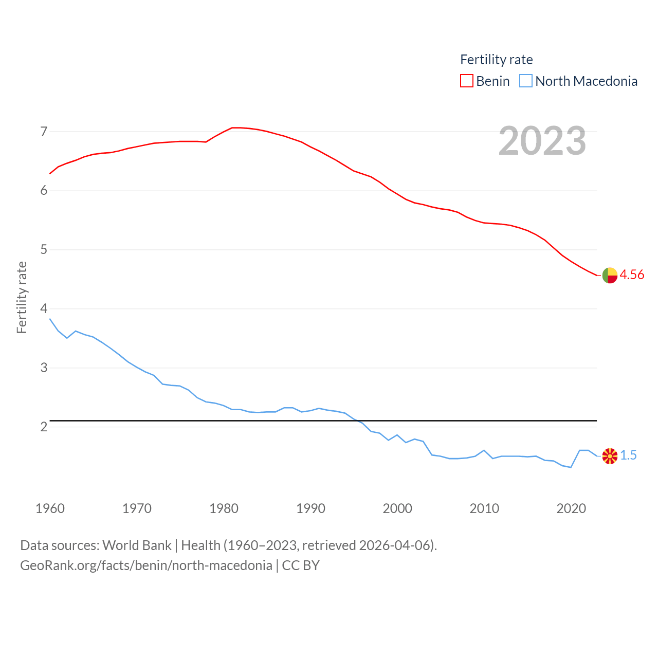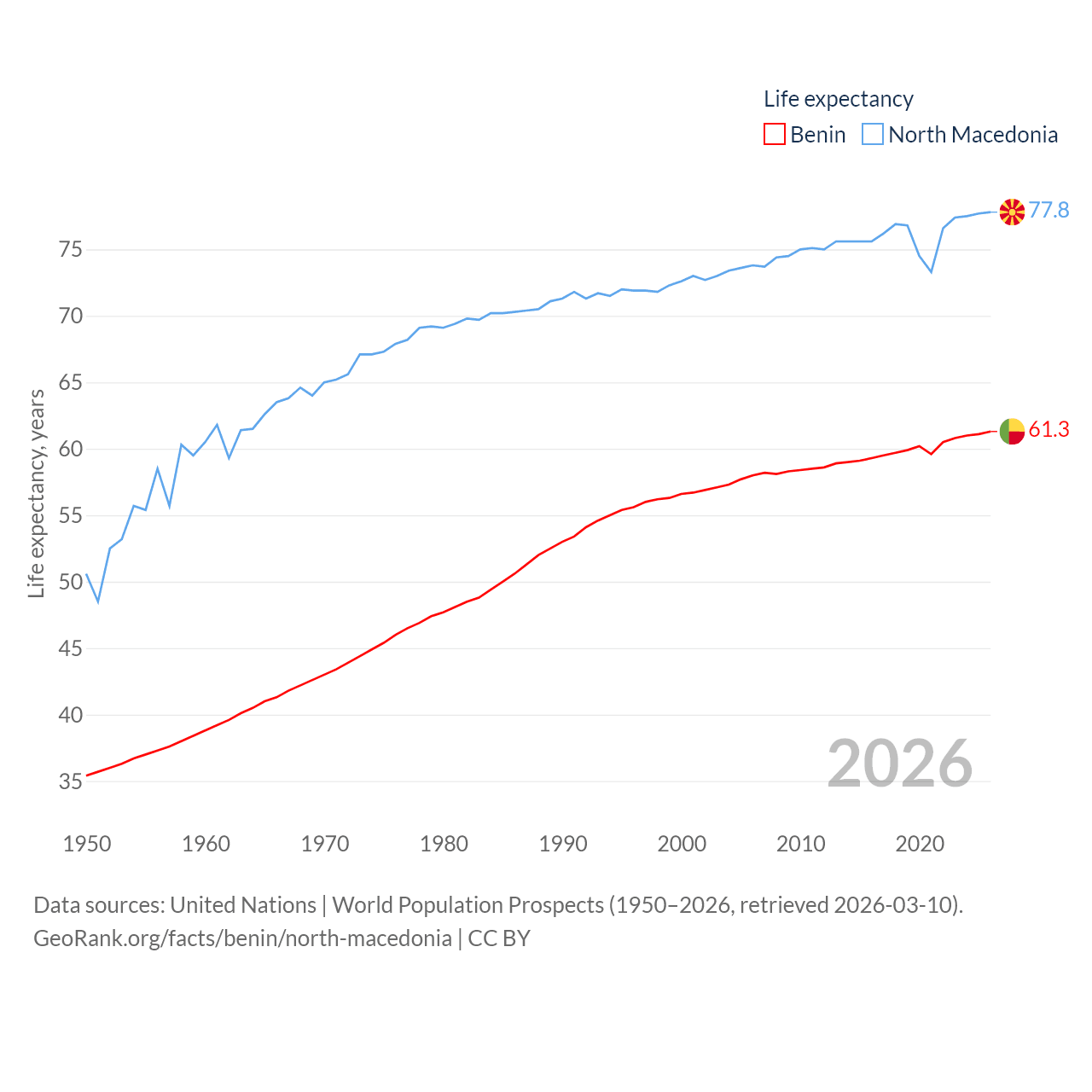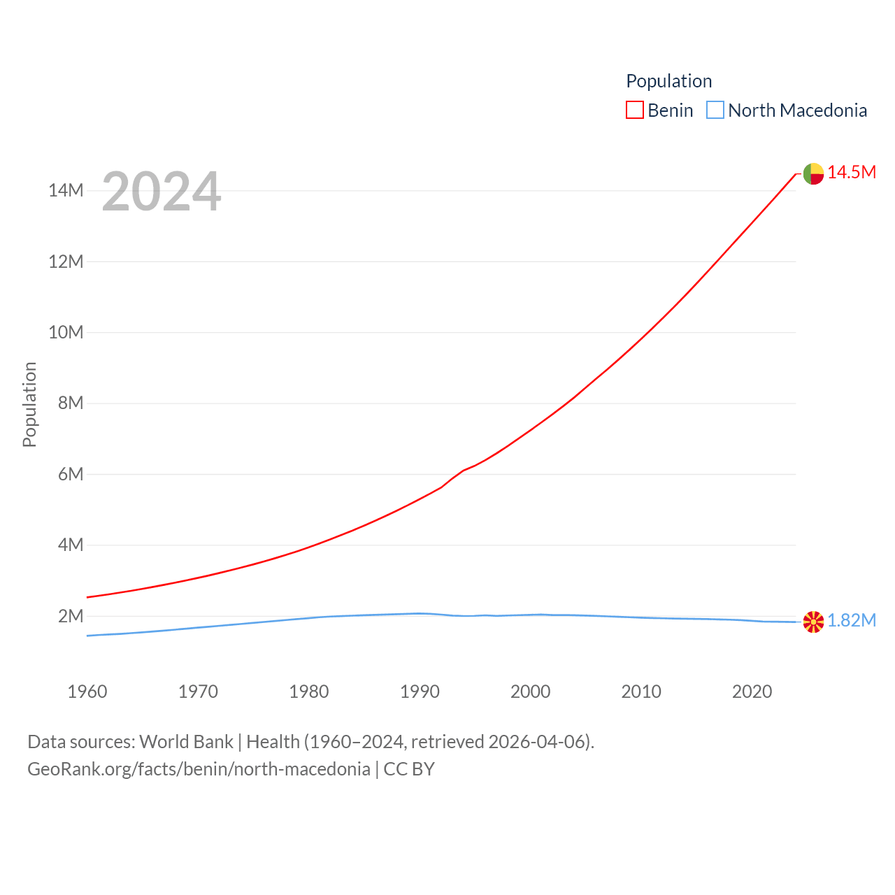 Benin has a population of 14.5M (ranked 76/197), compared with 1.82M in North Macedonia (ranked 150/197). Benin's land area is 43,537 sq mi versus 9,737 sq mi for North Macedonia (ranked 99th vs. 145th).