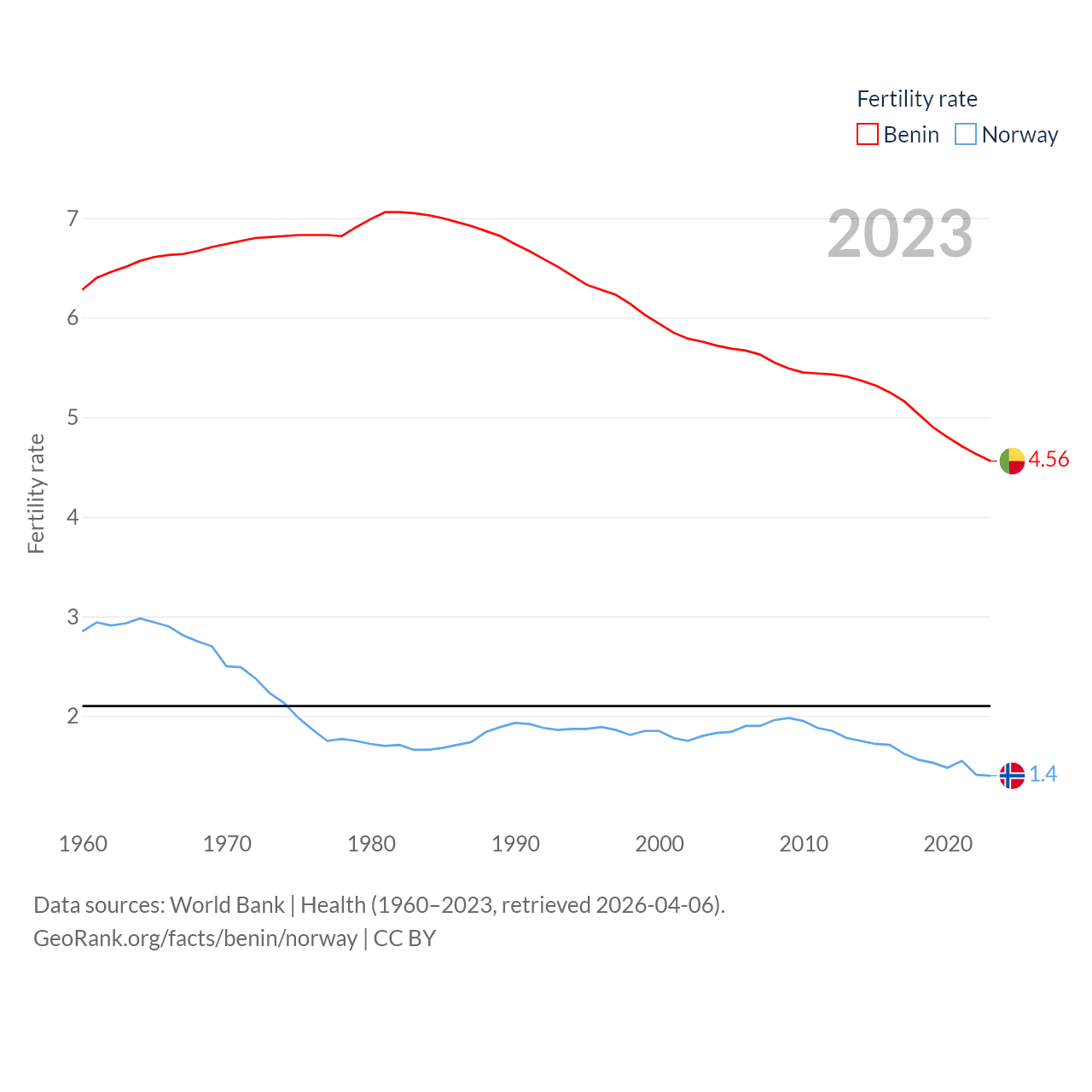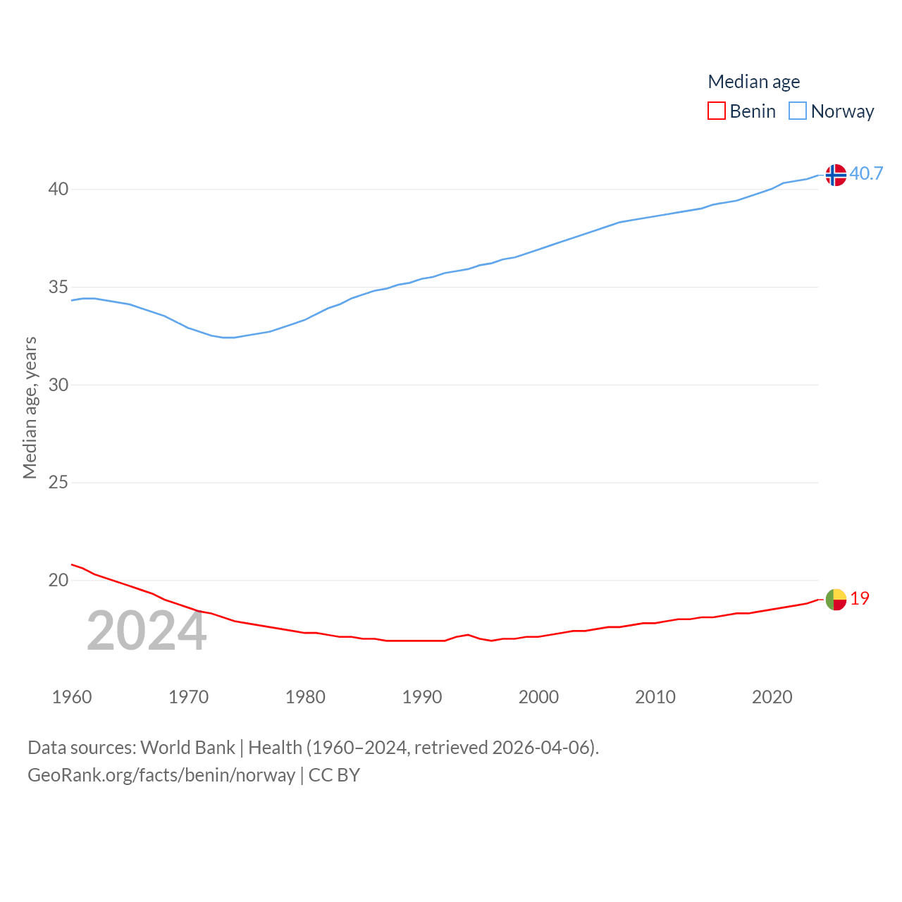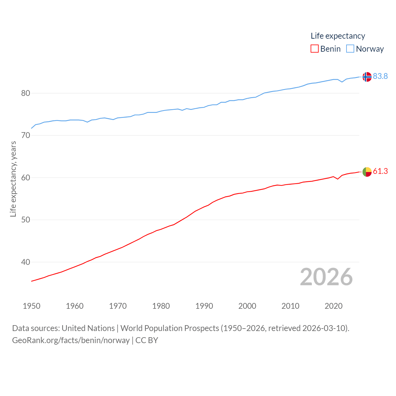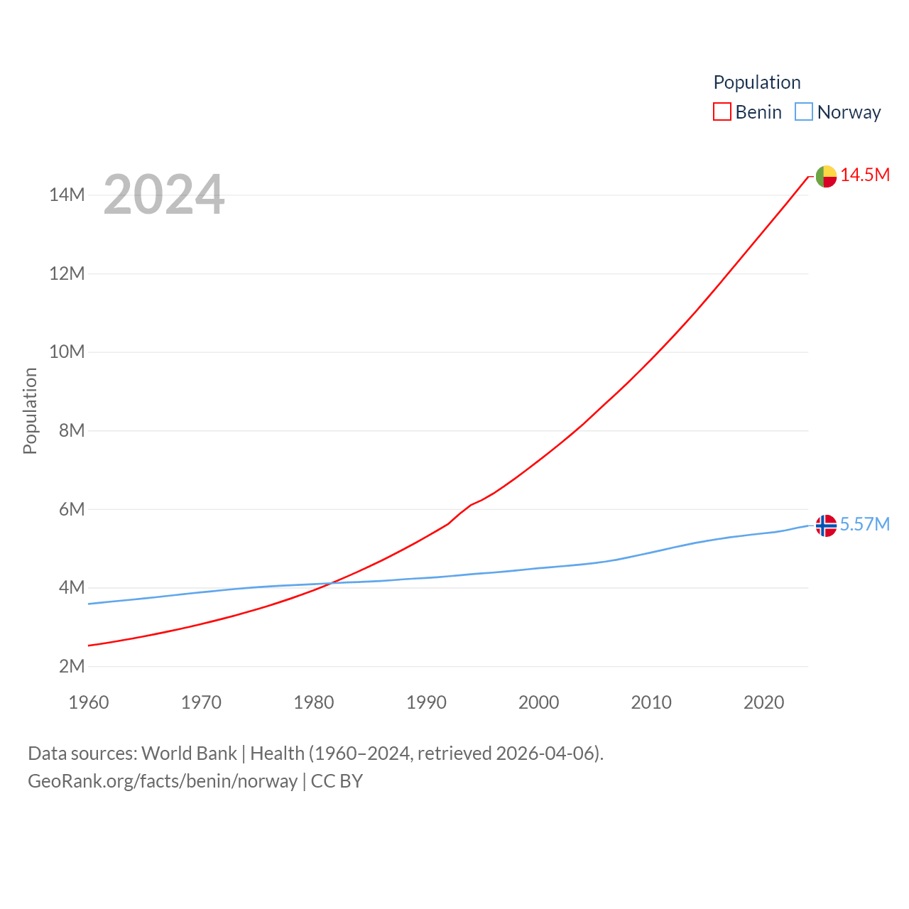 Benin has a population of 14.5M (ranked 76/197), compared with 5.57M in Norway (ranked 118/197). Benin's land area is 43,537 sq mi versus 140,645 sq mi for Norway (ranked 99th vs. 62nd).