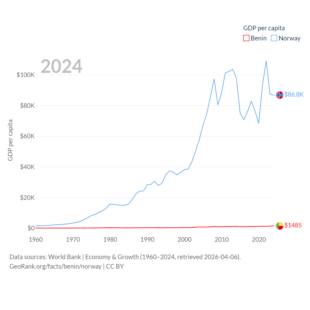 By GDP, Benin ranks 126/197 ($21.5B) and Norway ranks 32/197 ($484B). By GDP per capita, Benin ranks 162/197 ($1,485), while Norway ranks 8/197 ($86,785).