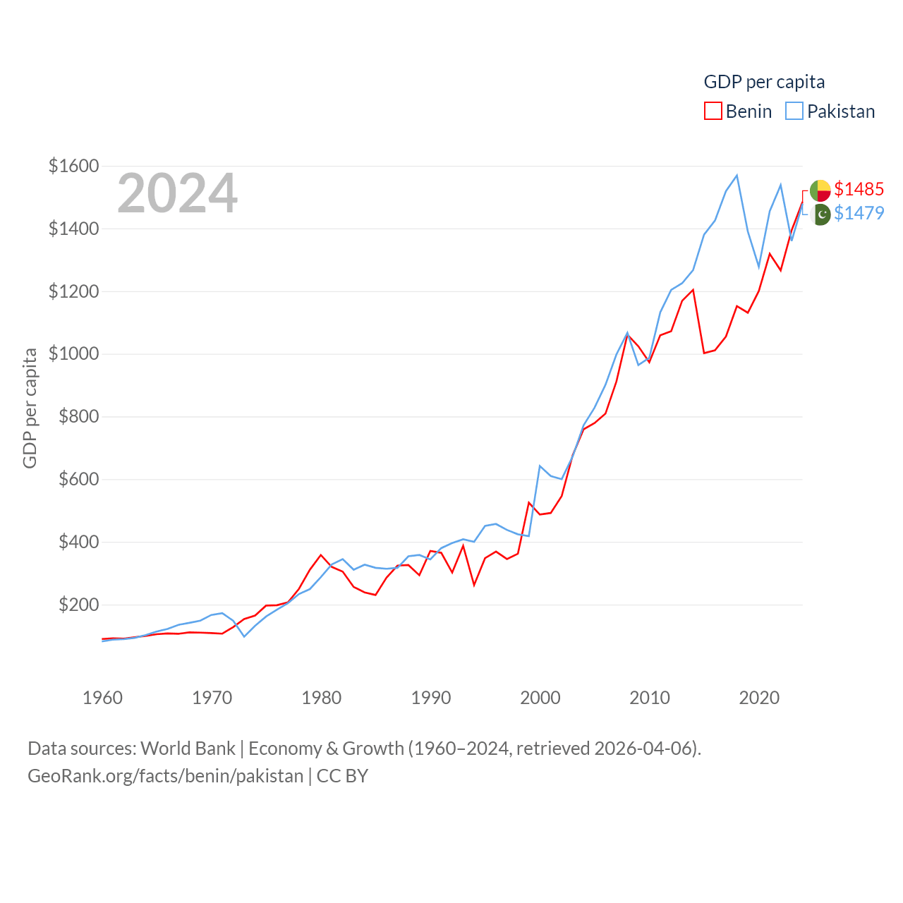By GDP, Benin ranks 126/197 ($21.5B) and Pakistan ranks 43/197 ($372B). By GDP per capita, Benin ranks 162/197 ($1,485), while Pakistan ranks 163/197 ($1,479).