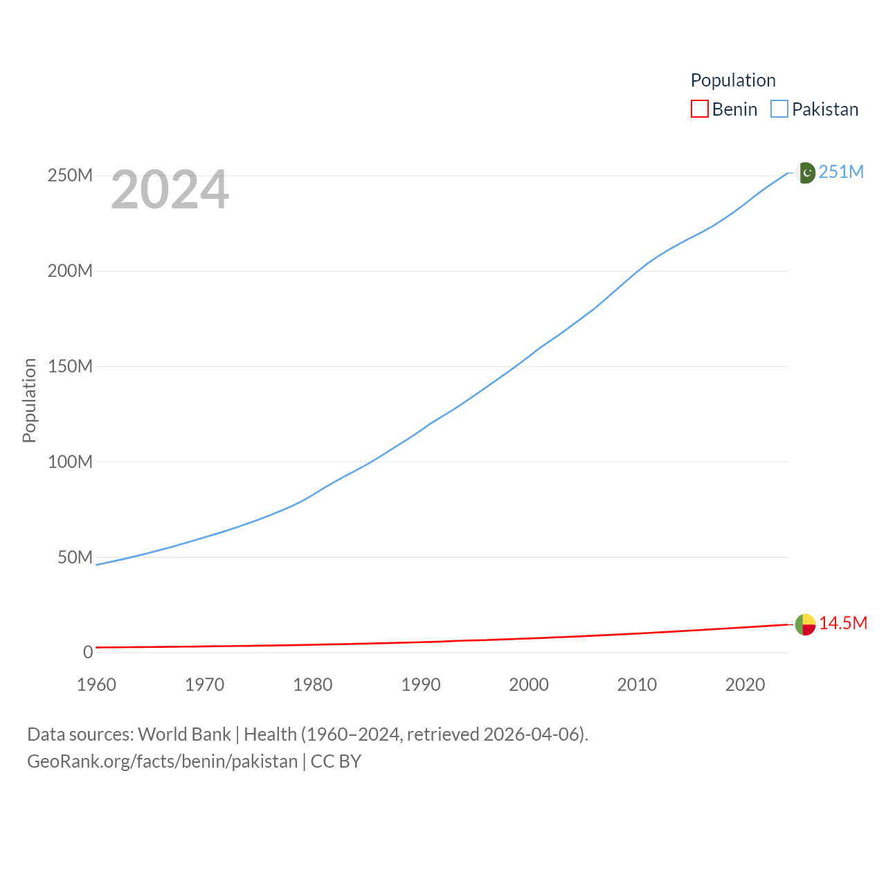 Benin has a population of 14.5M (ranked 76/197), compared with 251M in Pakistan (ranked 5/197). Benin's land area is 43,537 sq mi versus 297,638 sq mi for Pakistan (ranked 99th vs. 35th).