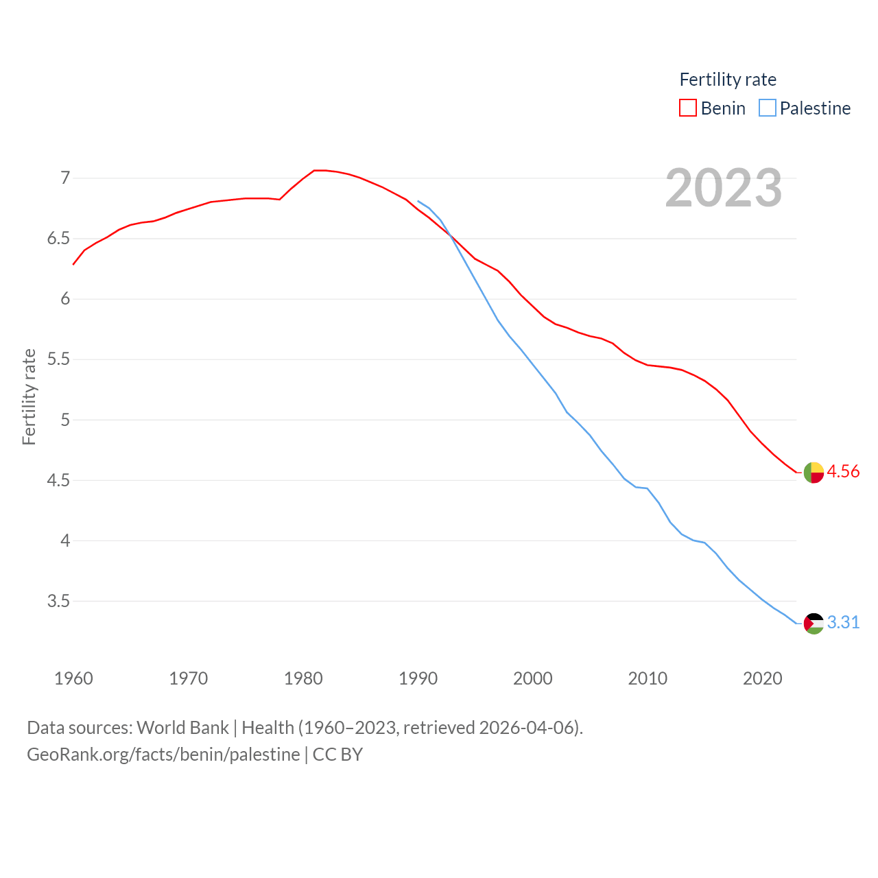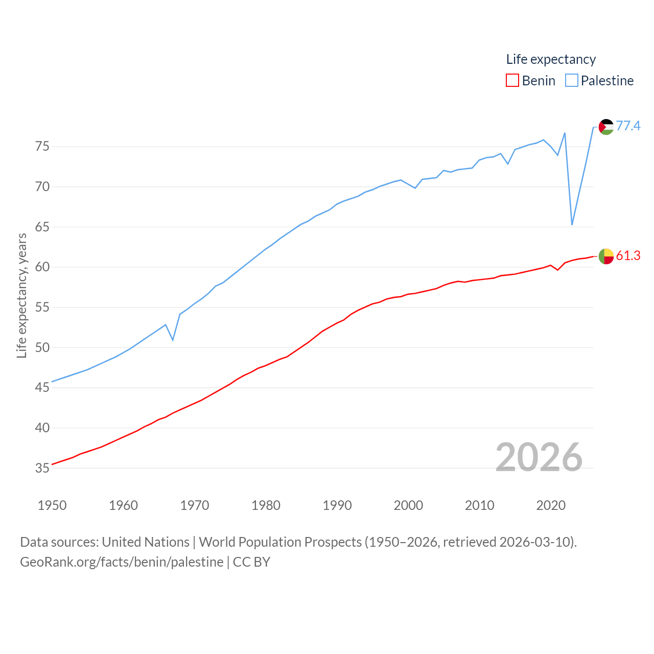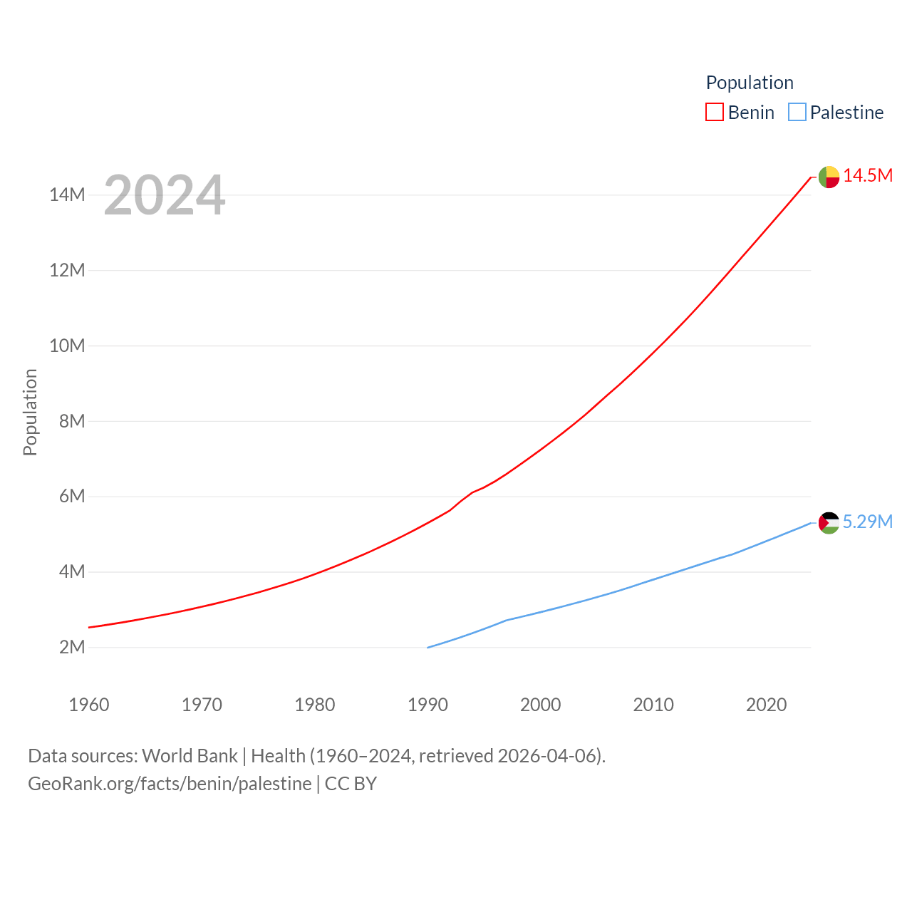Benin has a population of 14.5M (ranked 76/197), compared with 5.29M in Palestine (ranked 122/197). Benin's land area is 43,537 sq mi versus 2,326 sq mi for Palestine (ranked 99th vs. 164th).
