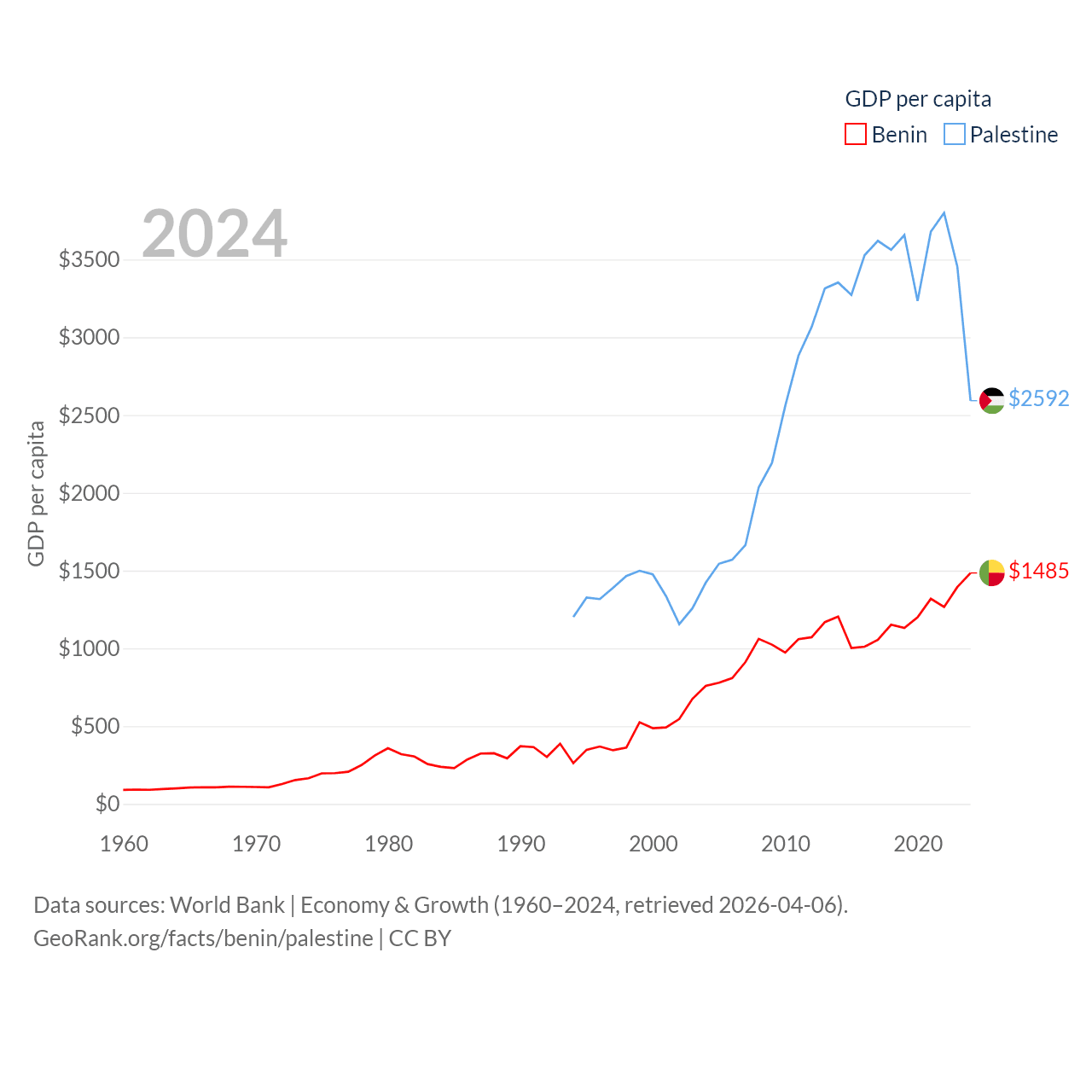 By GDP, Benin ranks 126/197 ($21.5B) and Palestine ranks 146/197 ($13.7B). By GDP per capita, Benin ranks 162/197 ($1,485), while Palestine ranks 147/197 ($2,592).