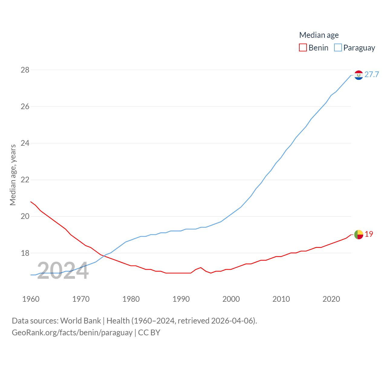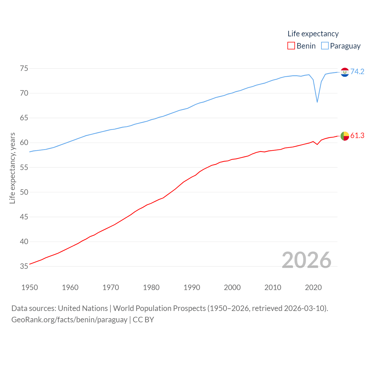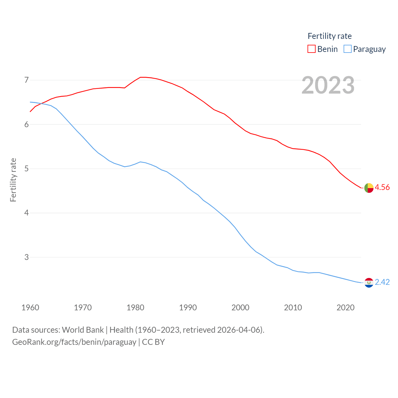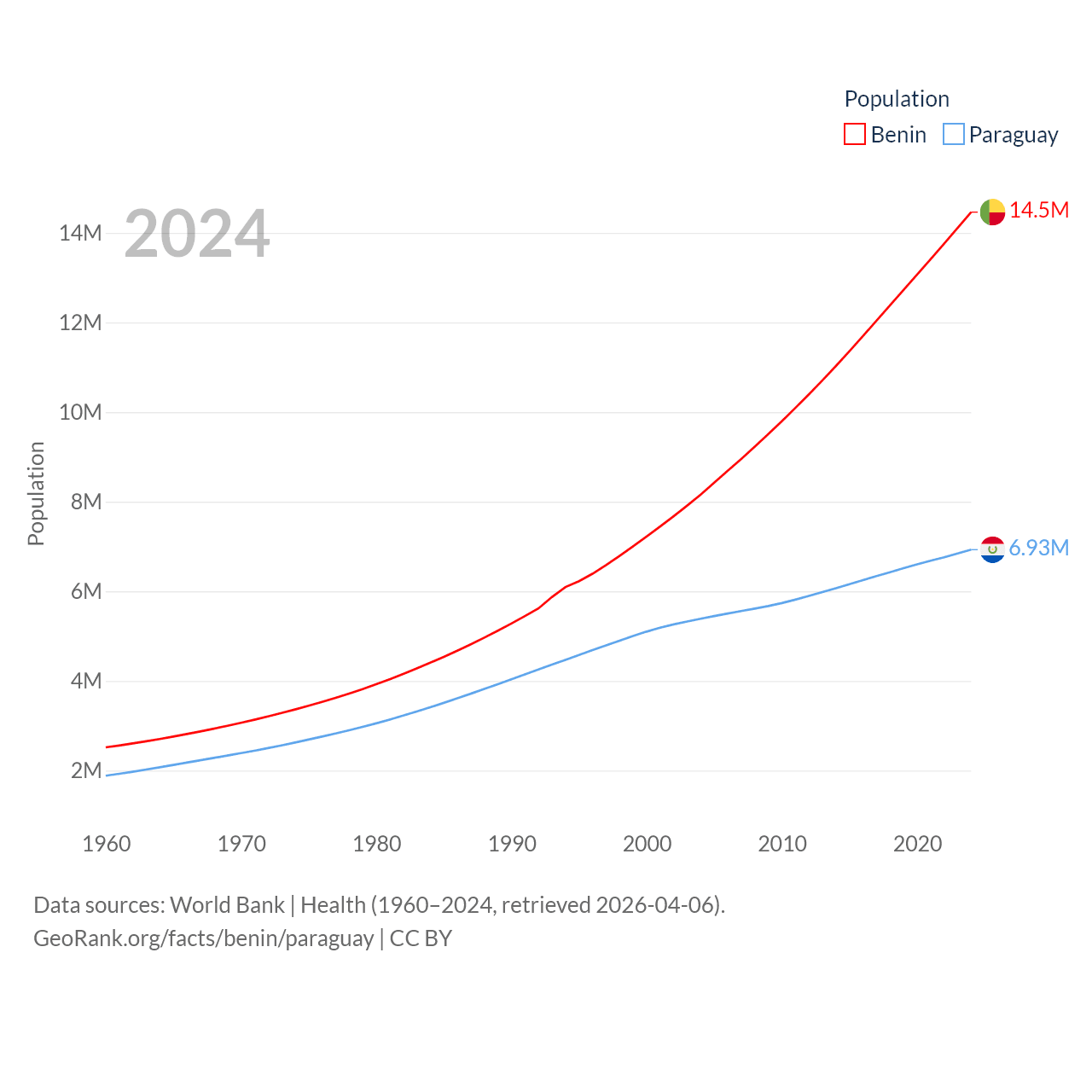 Benin has a population of 14.5M (ranked 76/197), compared with 6.93M in Paraguay (ranked 107/197). Benin's land area is 43,537 sq mi versus 152,901 sq mi for Paraguay (ranked 99th vs. 59th).