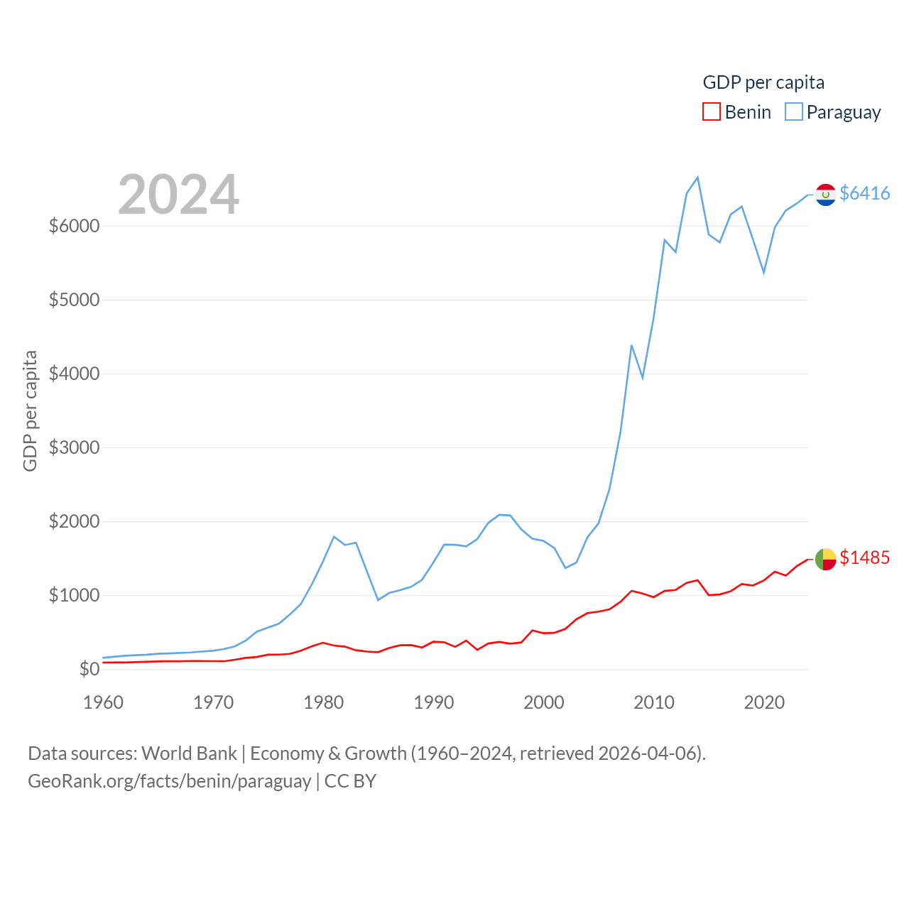 By GDP, Benin ranks 126/197 ($21.5B) and Paraguay ranks 98/197 ($44.5B). By GDP per capita, Benin ranks 162/197 ($1,485), while Paraguay ranks 109/197 ($6,416).