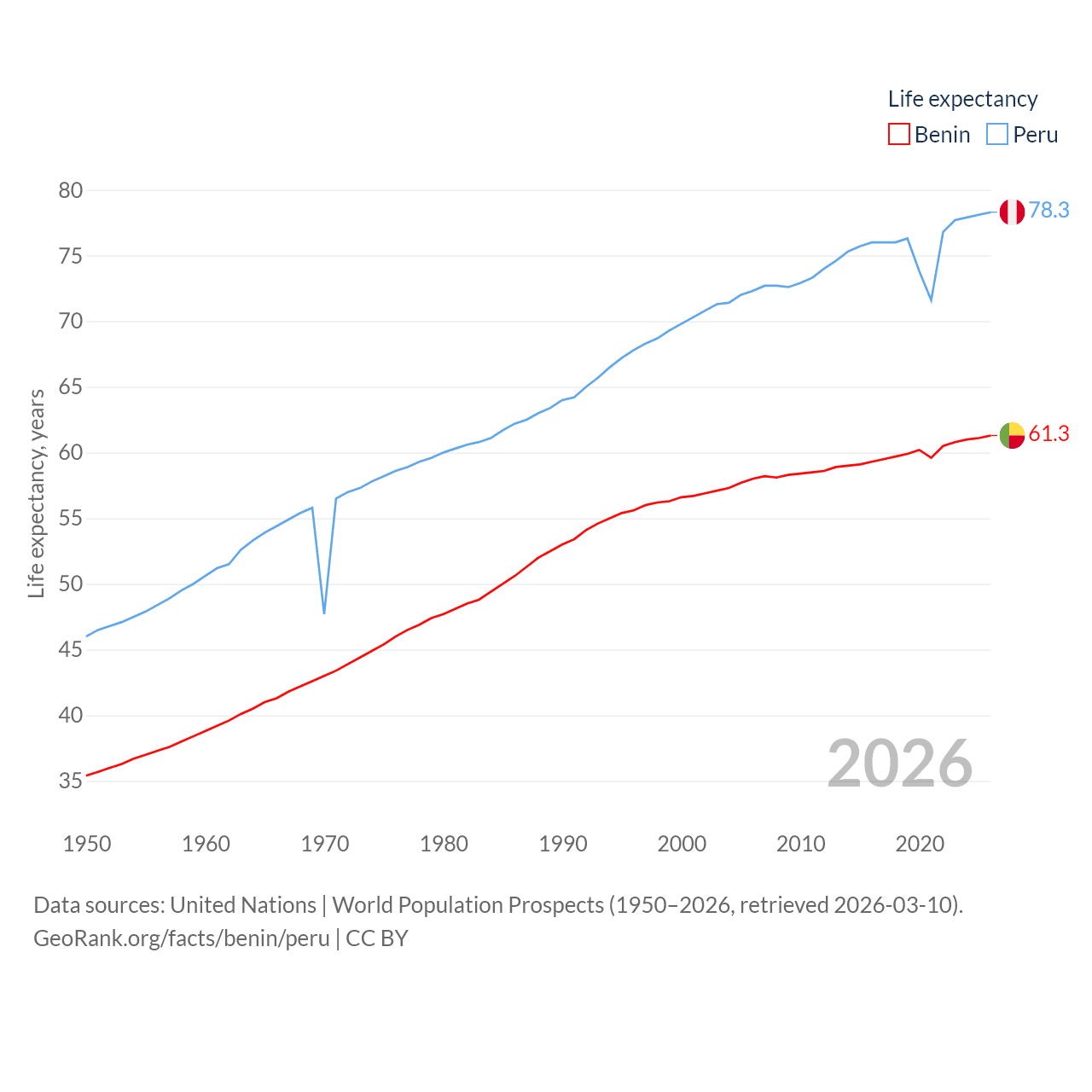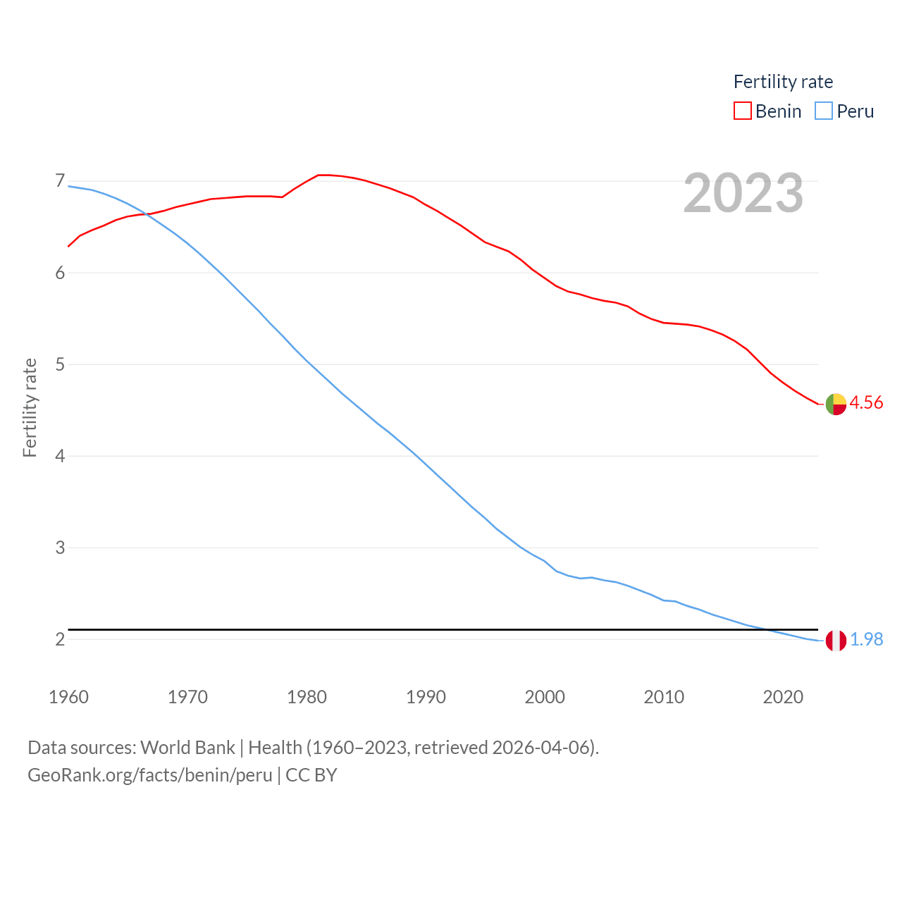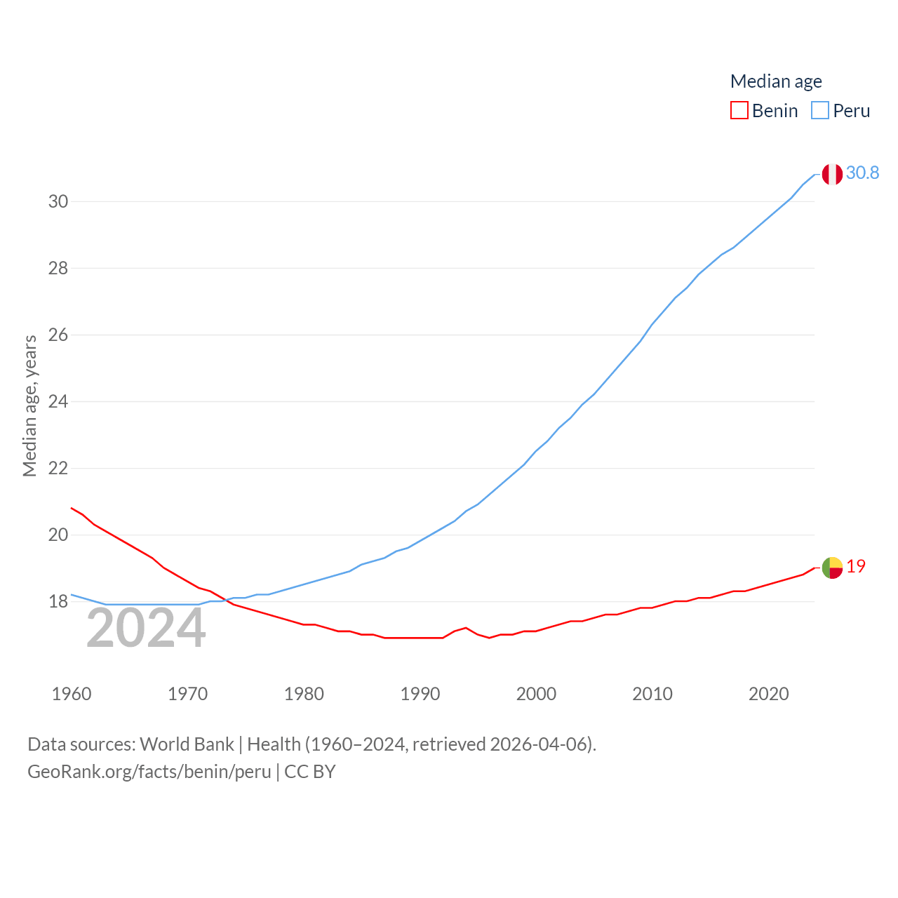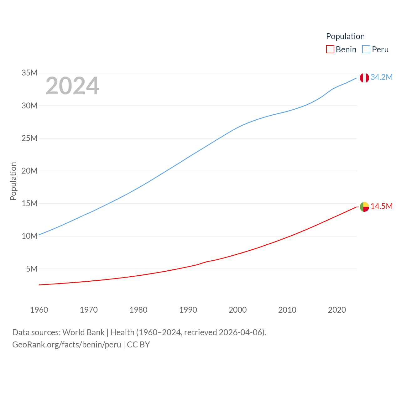 Benin has a population of 14.5M (ranked 76/197), compared with 34.2M in Peru (ranked 48/197). Benin's land area is 43,537 sq mi versus 494,211 sq mi for Peru (ranked 99th vs. 19th).