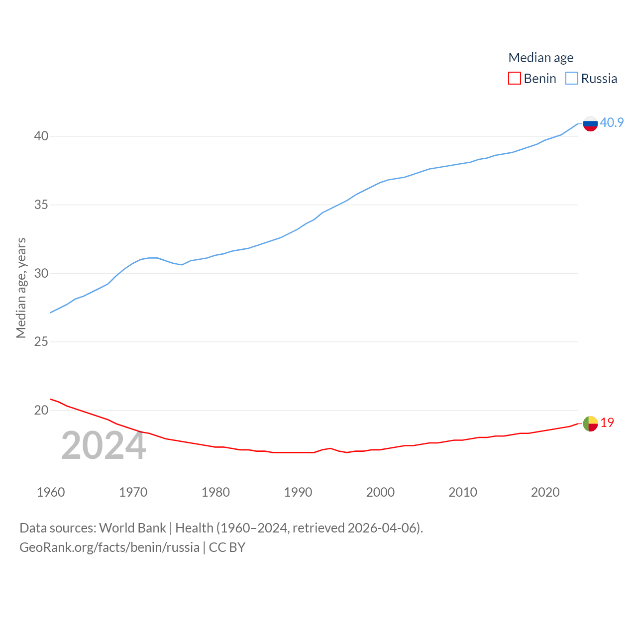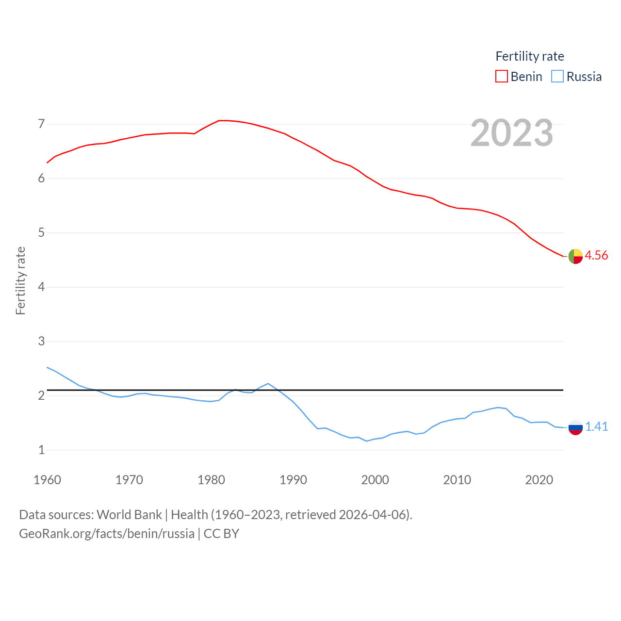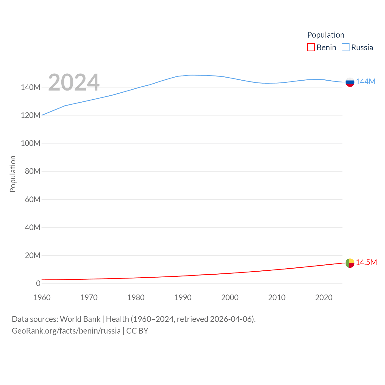 Benin has a population of 14.5M (ranked 76/197), compared with 144M in Russia (ranked 9/197). Benin's land area is 43,537 sq mi versus 6,323,145 sq mi for Russia (ranked 99th vs. 1st).
