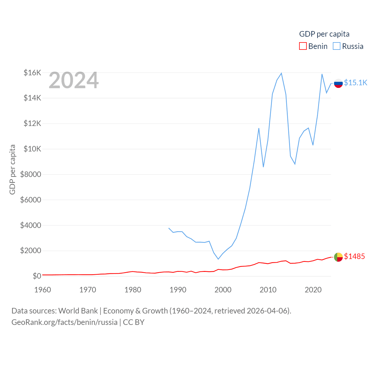 By GDP, Benin ranks 126/197 ($21.5B) and Russia ranks 11/197 ($2.17T). By GDP per capita, Benin ranks 162/197 ($1,485), while Russia ranks 68/197 ($15,145).