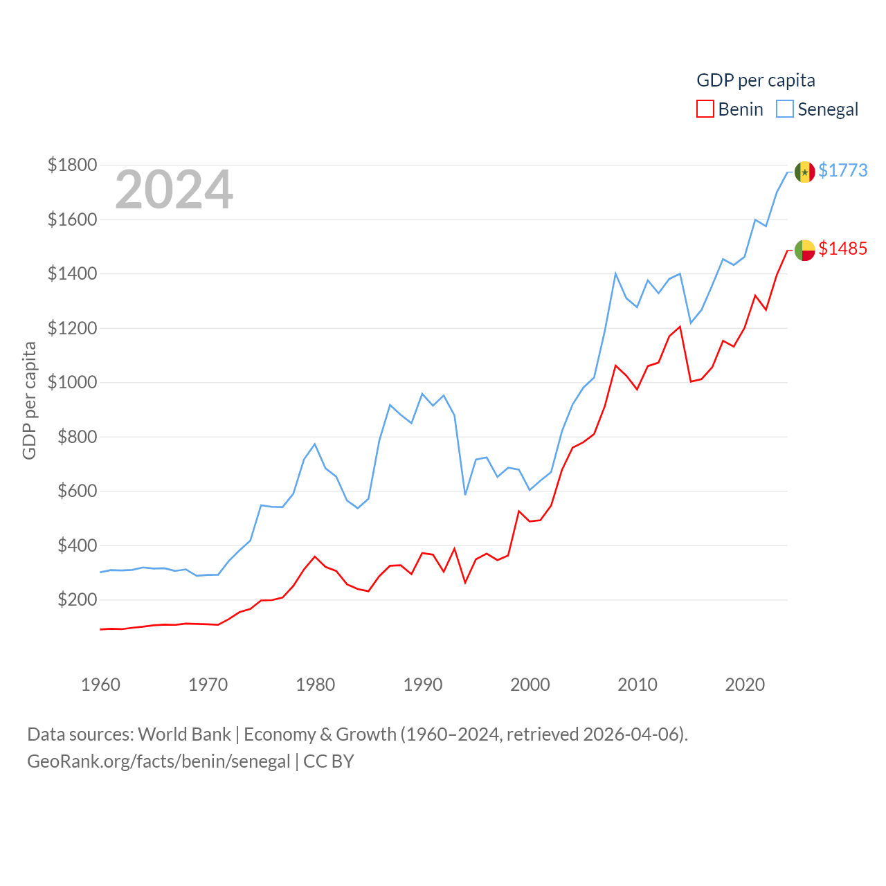 By GDP, Benin ranks 126/197 ($21.5B) and Senegal ranks 109/197 ($32.8B). By GDP per capita, Benin ranks 162/197 ($1,485), while Senegal ranks 159/197 ($1,773).