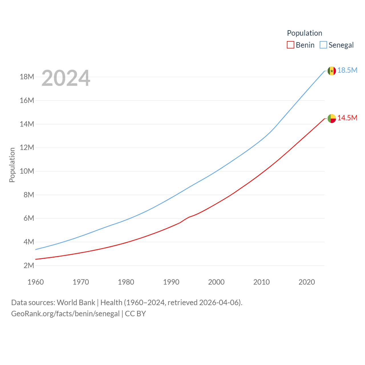 Benin has a population of 14.5M (ranked 76/197), compared with 18.5M in Senegal (ranked 69/197). Benin's land area is 43,537 sq mi versus 74,336 sq mi for Senegal (ranked 99th vs. 85th).