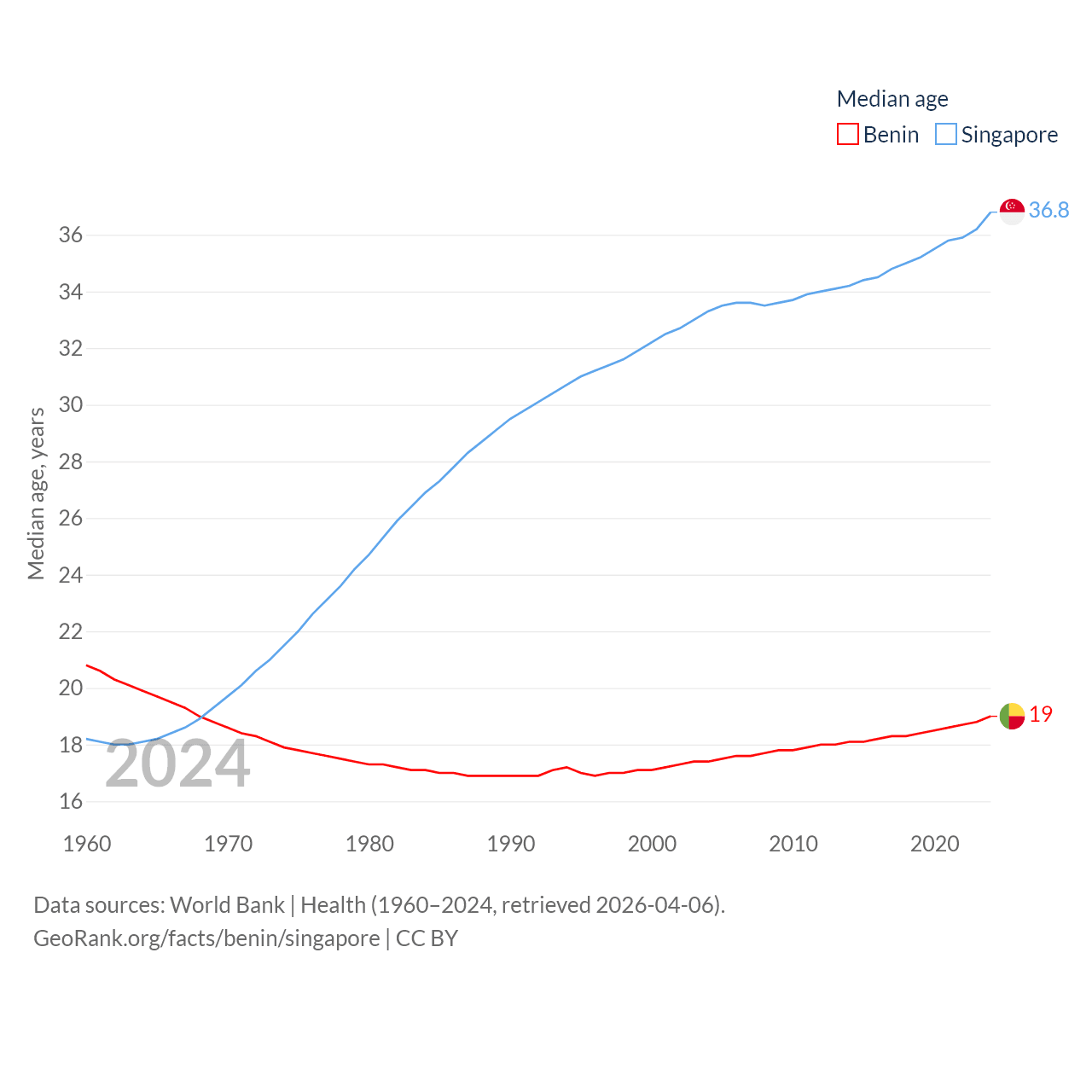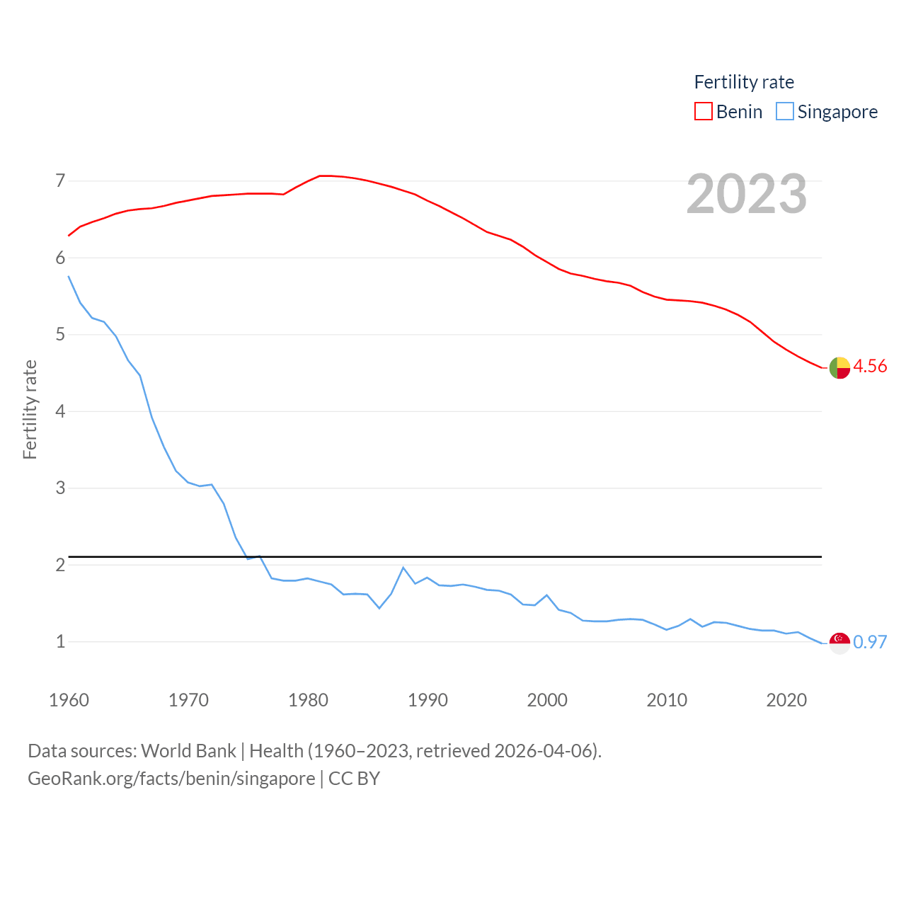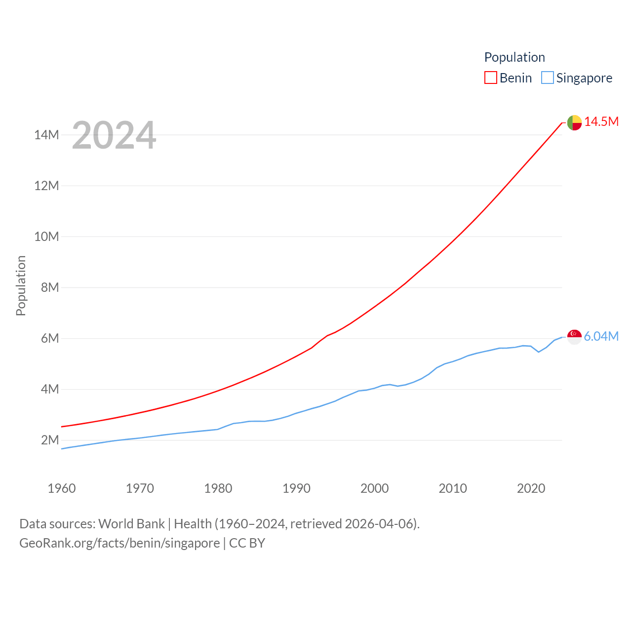 Benin has a population of 14.5M (ranked 76/197), compared with 6.04M in Singapore (ranked 113/197). Benin's land area is 43,537 sq mi versus 277.2 sq mi for Singapore (ranked 99th vs. 177th).