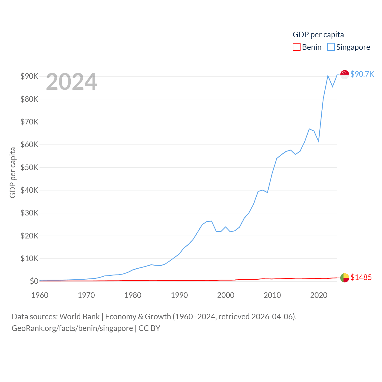 By GDP, Benin ranks 126/197 ($21.5B) and Singapore ranks 28/197 ($547B). By GDP per capita, Benin ranks 162/197 ($1,485), while Singapore ranks 7/197 ($90,674).