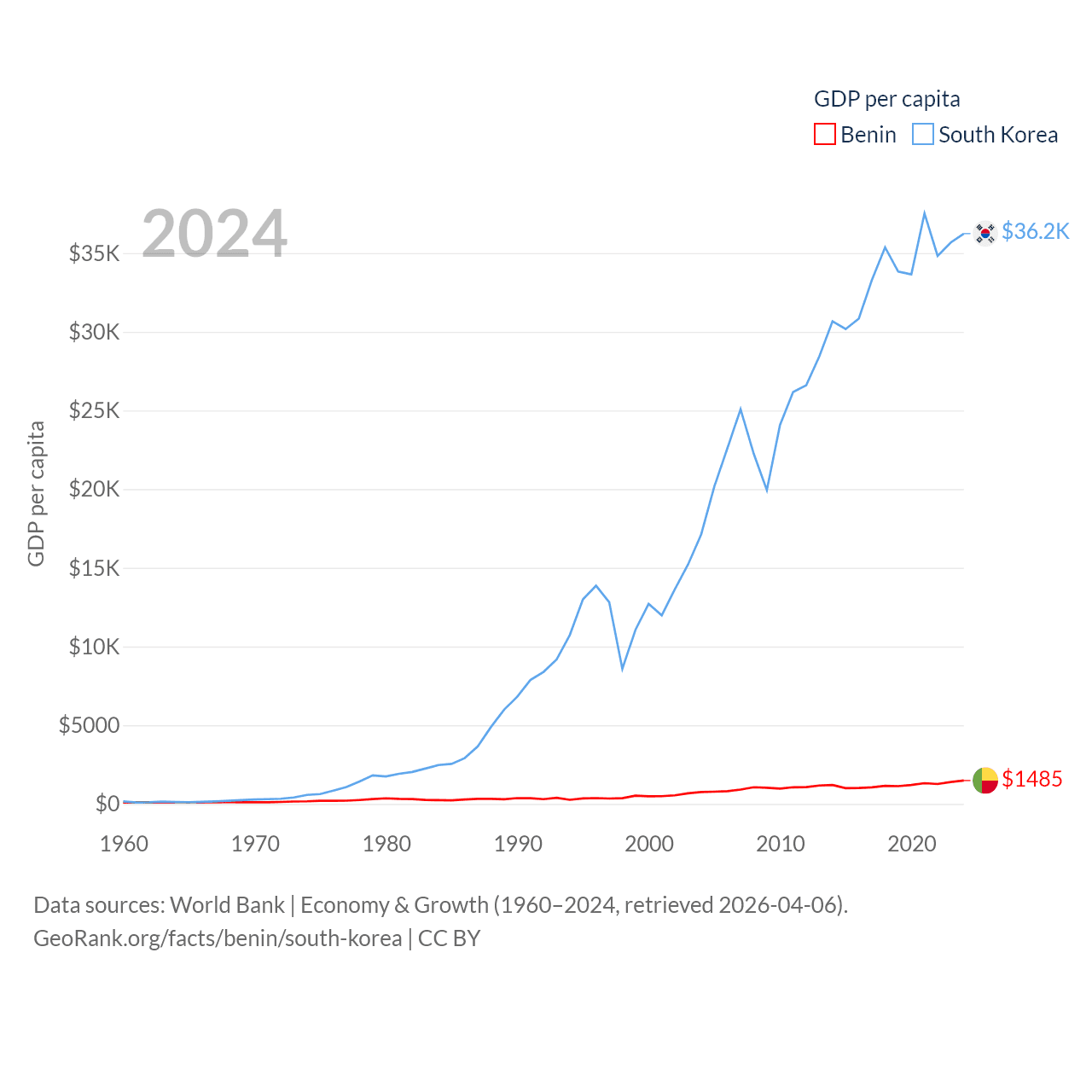 By GDP, Benin ranks 126/197 ($21.5B) and South Korea ranks 12/197 ($1.88T). By GDP per capita, Benin ranks 162/197 ($1,485), while South Korea ranks 31/197 ($36,239).