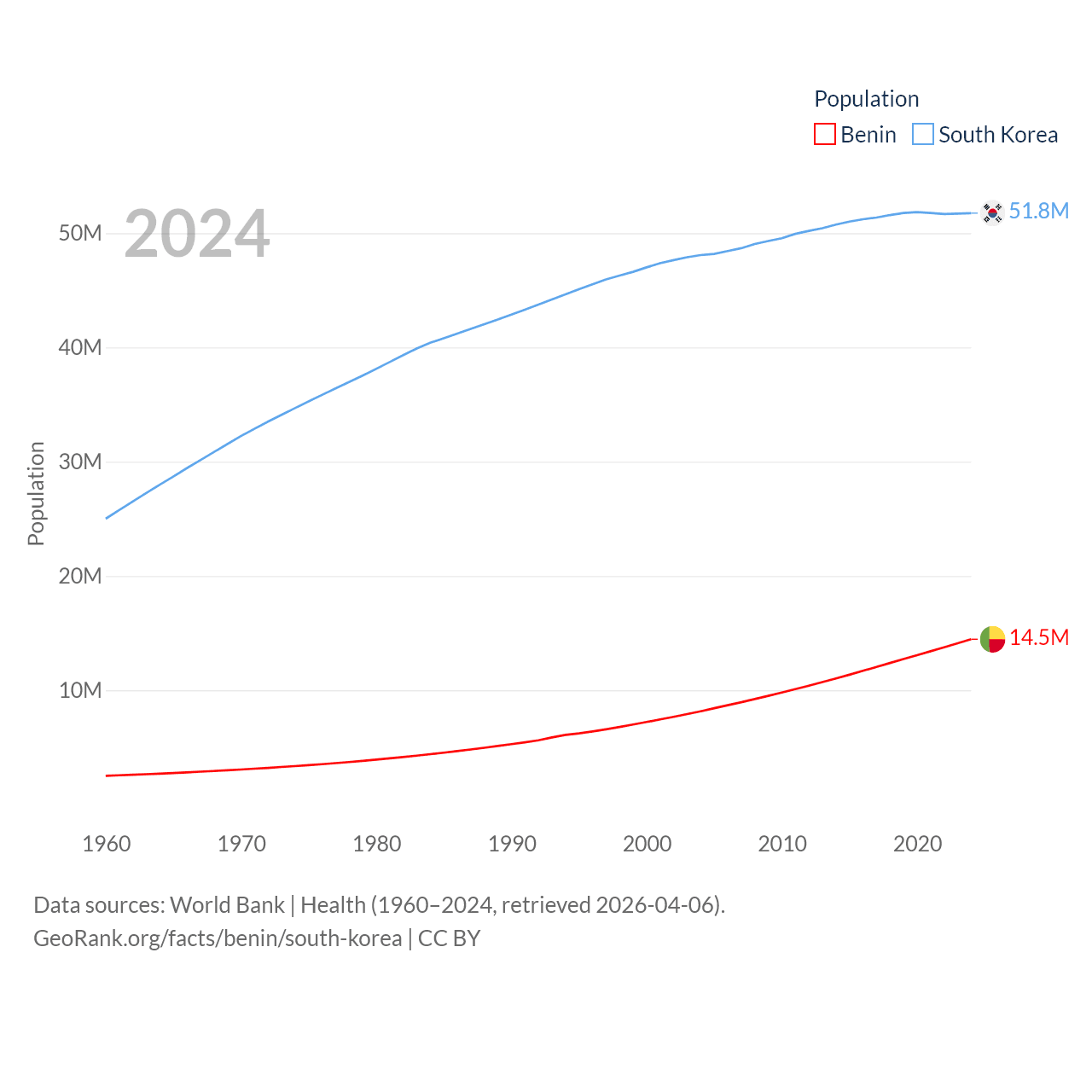 Benin has a population of 14.5M (ranked 76/197), compared with 51.8M in South Korea (ranked 29/197). Benin's land area is 43,537 sq mi versus 37,684 sq mi for South Korea (ranked 99th vs. 105th).