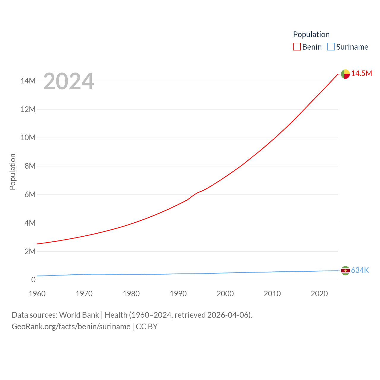 Benin has a population of 14.5M (ranked 76/197), compared with 634K in Suriname (ranked 165/197). Benin's land area is 43,537 sq mi versus 61,972 sq mi for Suriname (ranked 99th vs. 90th).