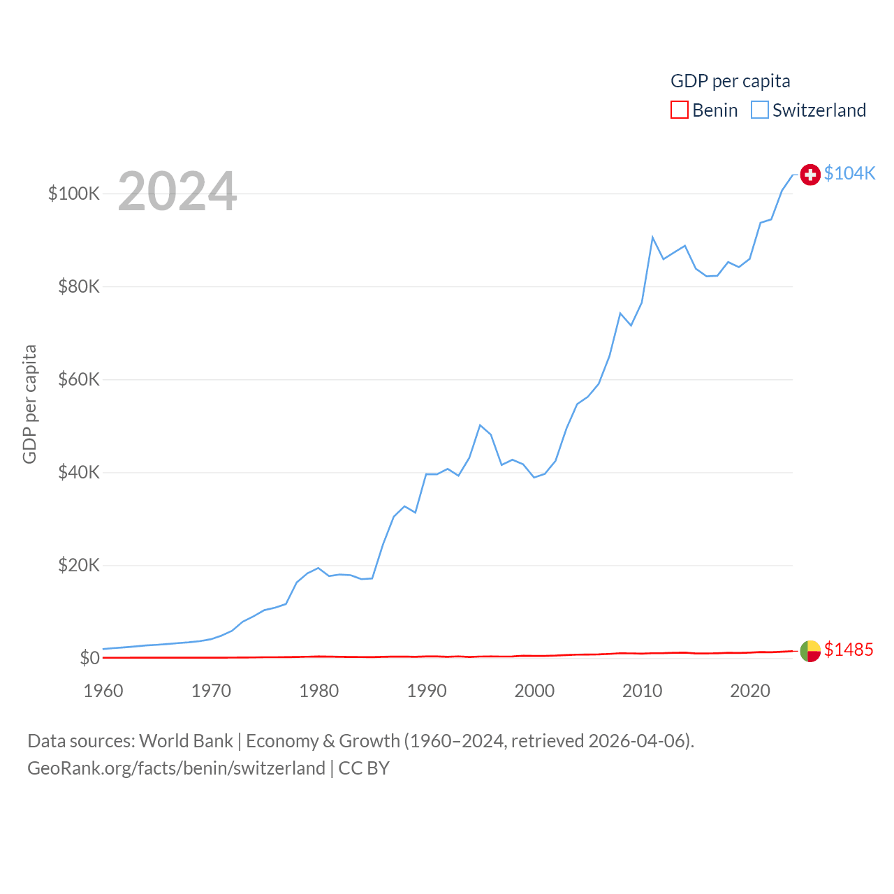 By GDP, Benin ranks 126/197 ($21.5B) and Switzerland ranks 20/197 ($937B). By GDP per capita, Benin ranks 162/197 ($1,485), while Switzerland ranks 5/197 ($103,998).
