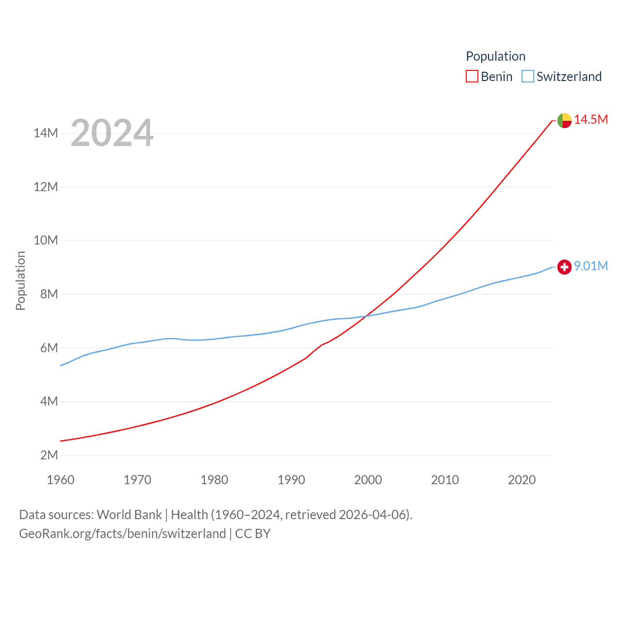 Benin has a population of 14.5M (ranked 76/197), compared with 9.01M in Switzerland (ranked 101/197). Benin's land area is 43,537 sq mi versus 15,255 sq mi for Switzerland (ranked 99th vs. 131st).