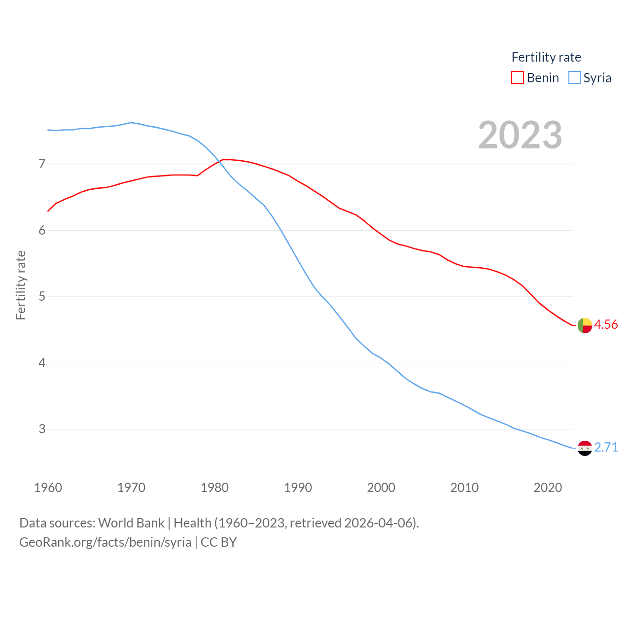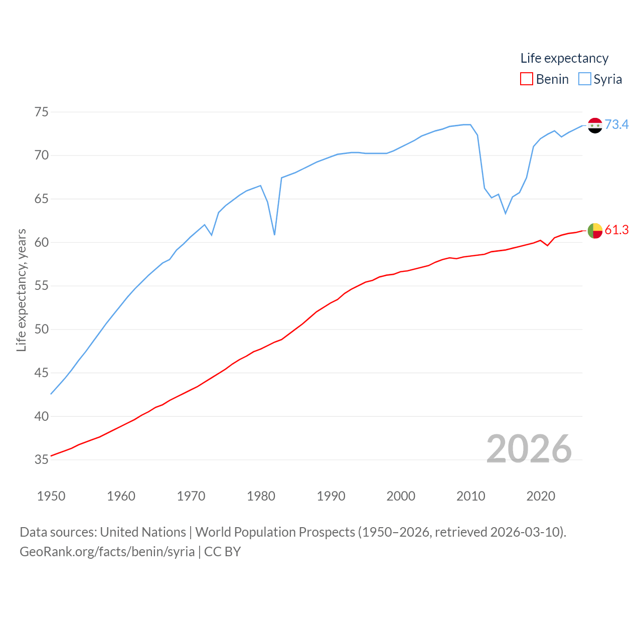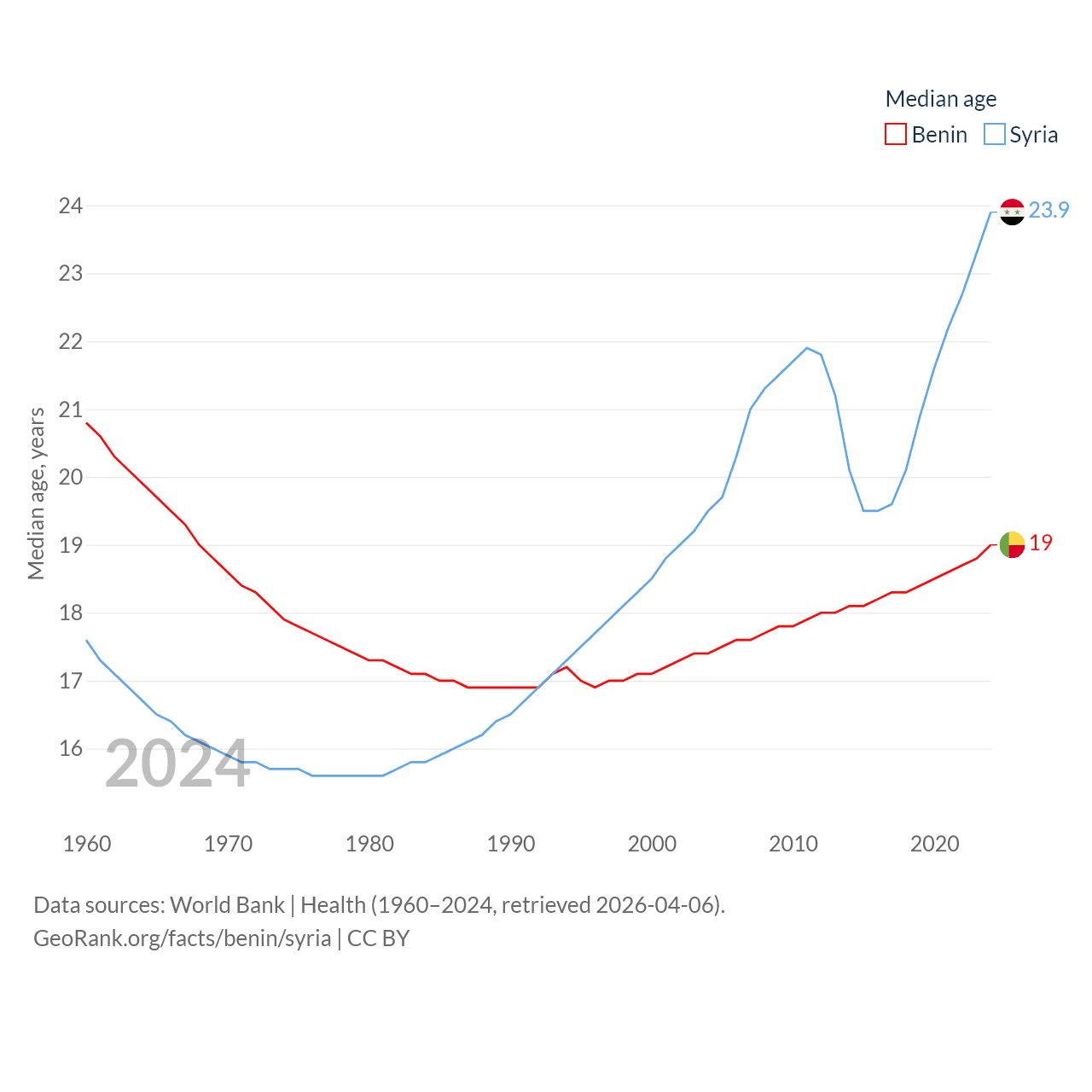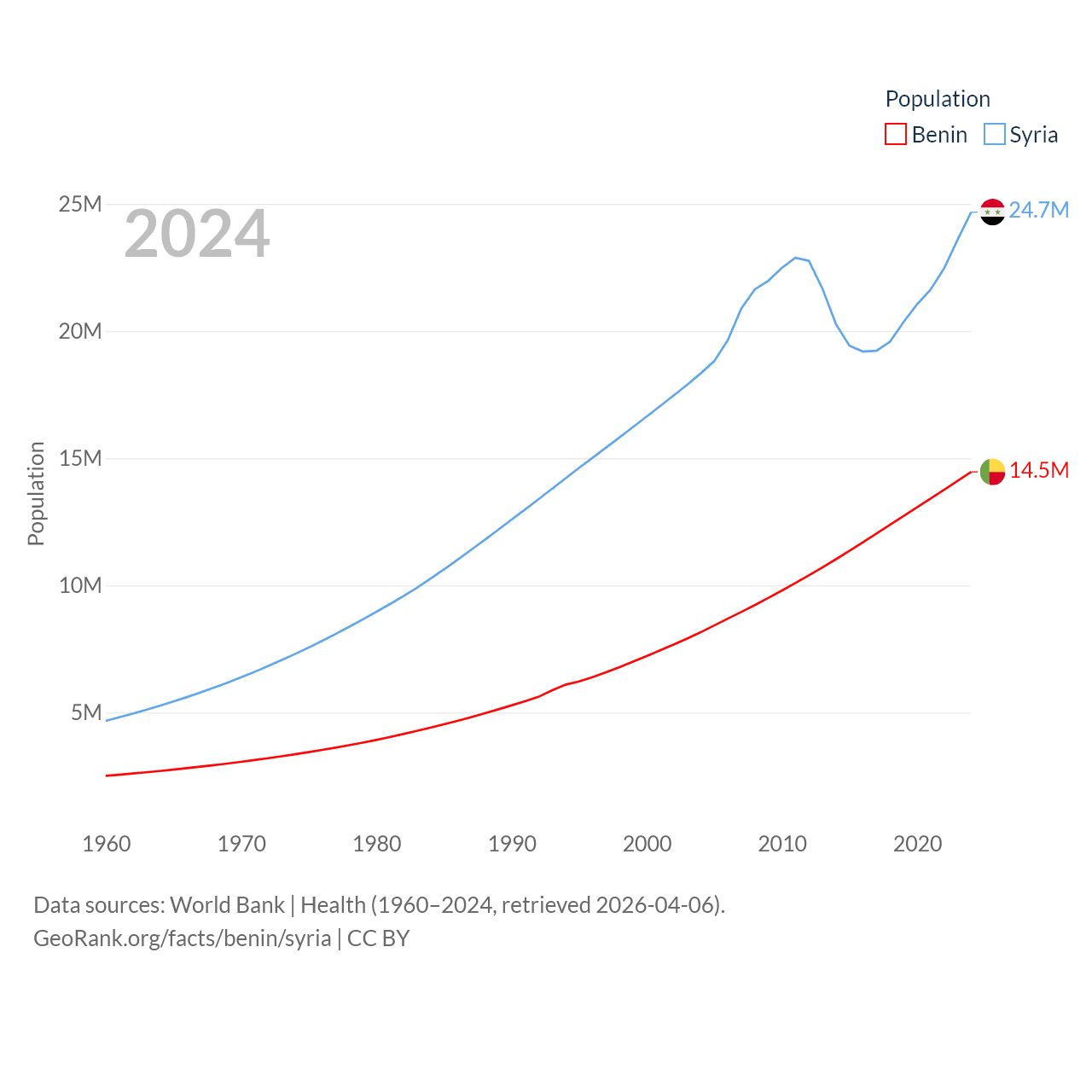 Benin has a population of 14.5M (ranked 76/197), compared with 24.7M in Syria (ranked 57/197). Benin's land area is 43,537 sq mi versus 70,900 sq mi for Syria (ranked 99th vs. 87th).