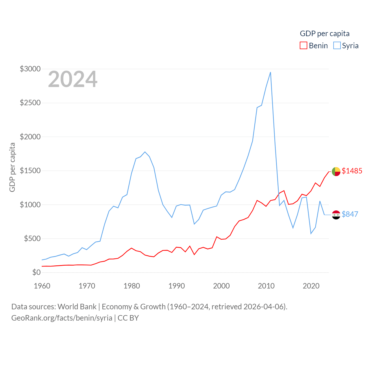By GDP, Benin ranks 126/197 ($21.5B) and Syria ranks 129/197 ($20B). By GDP per capita, Benin ranks 162/197 ($1,485), while Syria ranks 185/197 ($847).