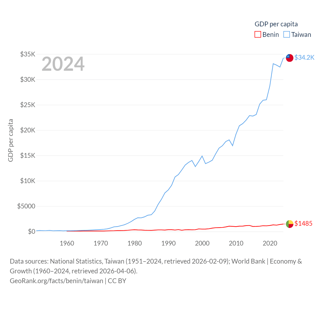 By GDP, Benin ranks 126/197 ($21.5B) and Taiwan ranks 22/197 ($802B). By GDP per capita, Benin ranks 162/197 ($1,485), while Taiwan ranks 35/197 ($34,238).