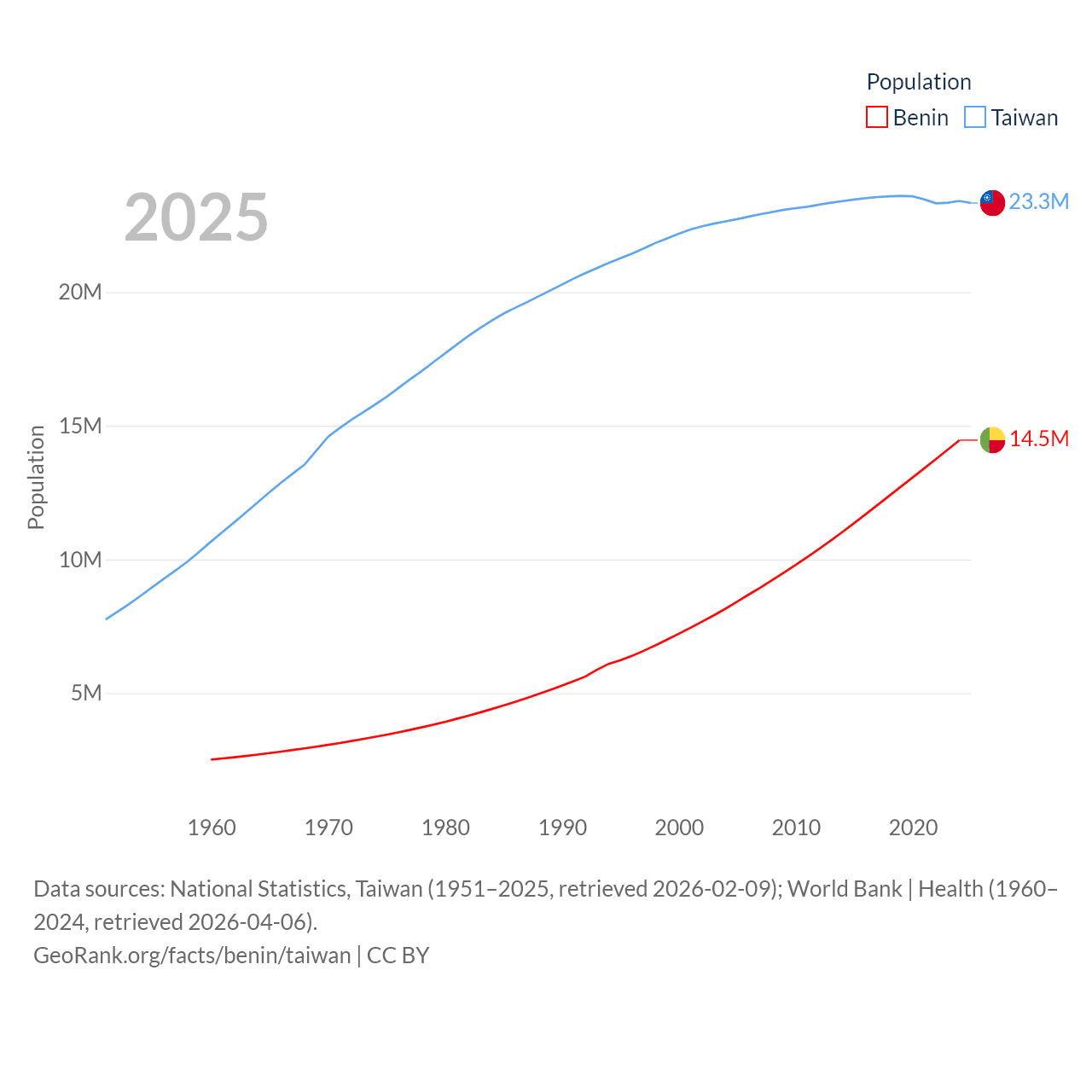 Benin has a population of 14.5M (ranked 76/197), compared with 23.3M in Taiwan (ranked 60/197). Benin's land area is 43,537 sq mi versus 13,976 sq mi for Taiwan (ranked 99th vs. 133rd).