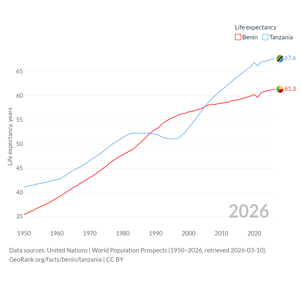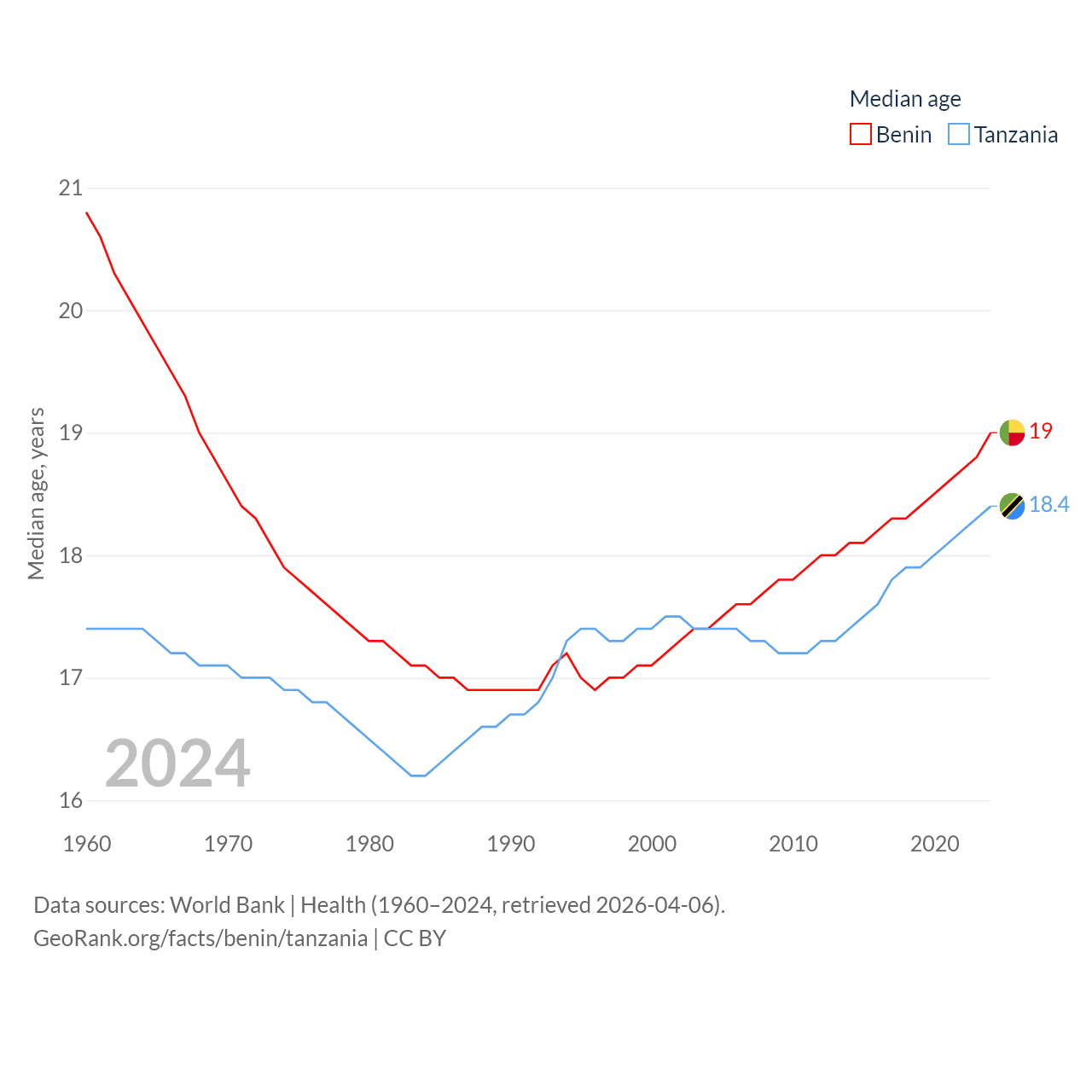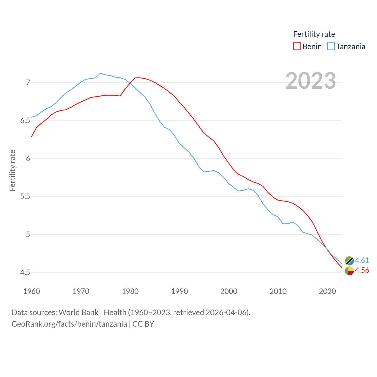 Benin has a population of 14.5M (ranked 76/197), compared with 68.6M in Tanzania (ranked 22/197). Benin's land area is 43,537 sq mi versus 342,009 sq mi for Tanzania (ranked 99th vs. 31st).