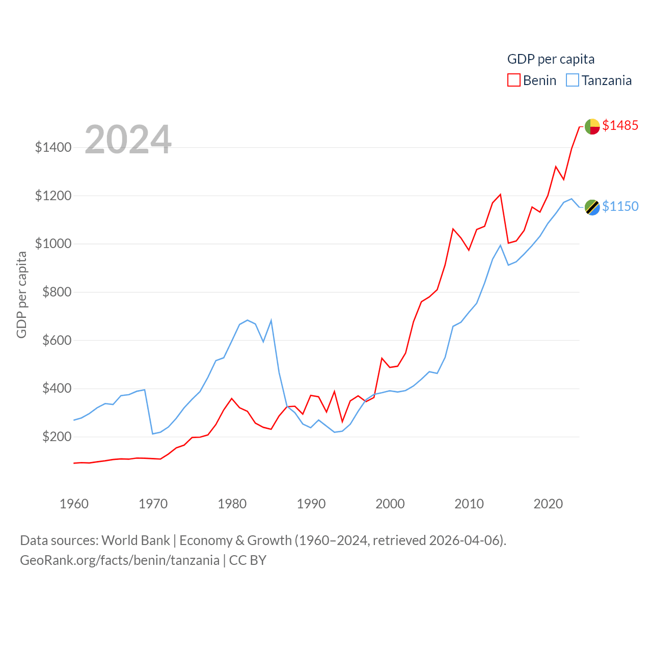 By GDP, Benin ranks 126/197 ($21.5B) and Tanzania ranks 82/197 ($78.8B). By GDP per capita, Benin ranks 162/197 ($1,485), while Tanzania ranks 170/197 ($1,150).