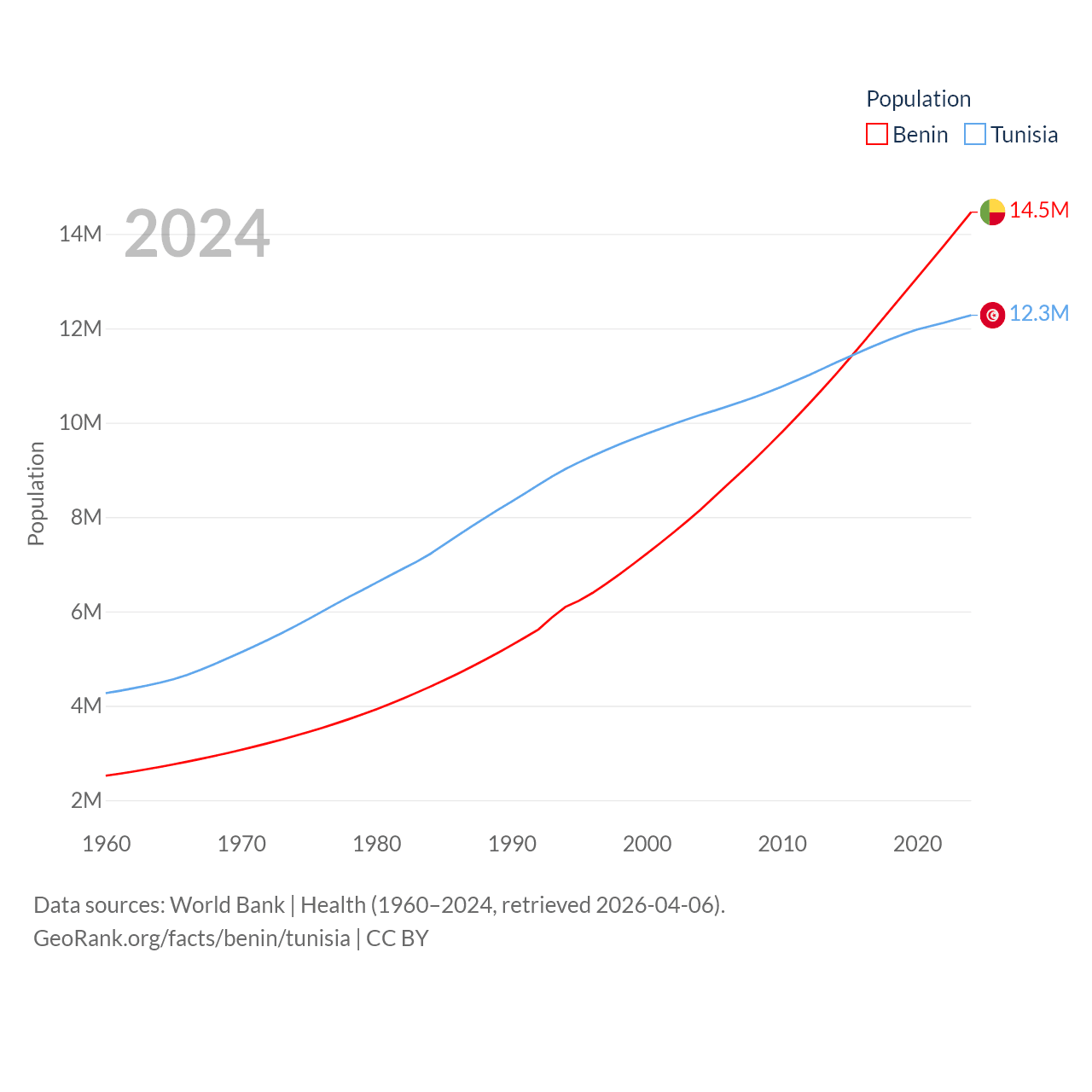 Benin has a population of 14.5M (ranked 76/197), compared with 12.3M in Tunisia (ranked 80/197). Benin's land area is 43,537 sq mi versus 59,985 sq mi for Tunisia (ranked 99th vs. 91st).