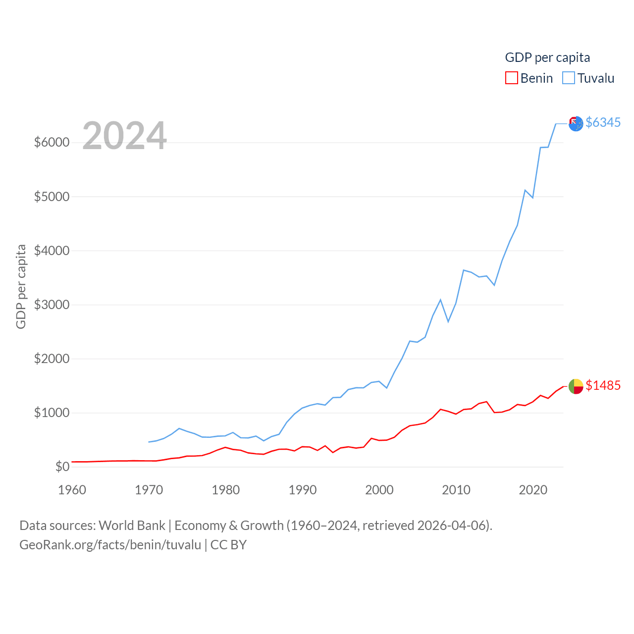 By GDP, Benin ranks 126/197 ($21.5B) and Tuvalu ranks 196/197 ($62.3M). By GDP per capita, Benin ranks 162/197 ($1,485), while Tuvalu ranks 110/197 ($6,345).