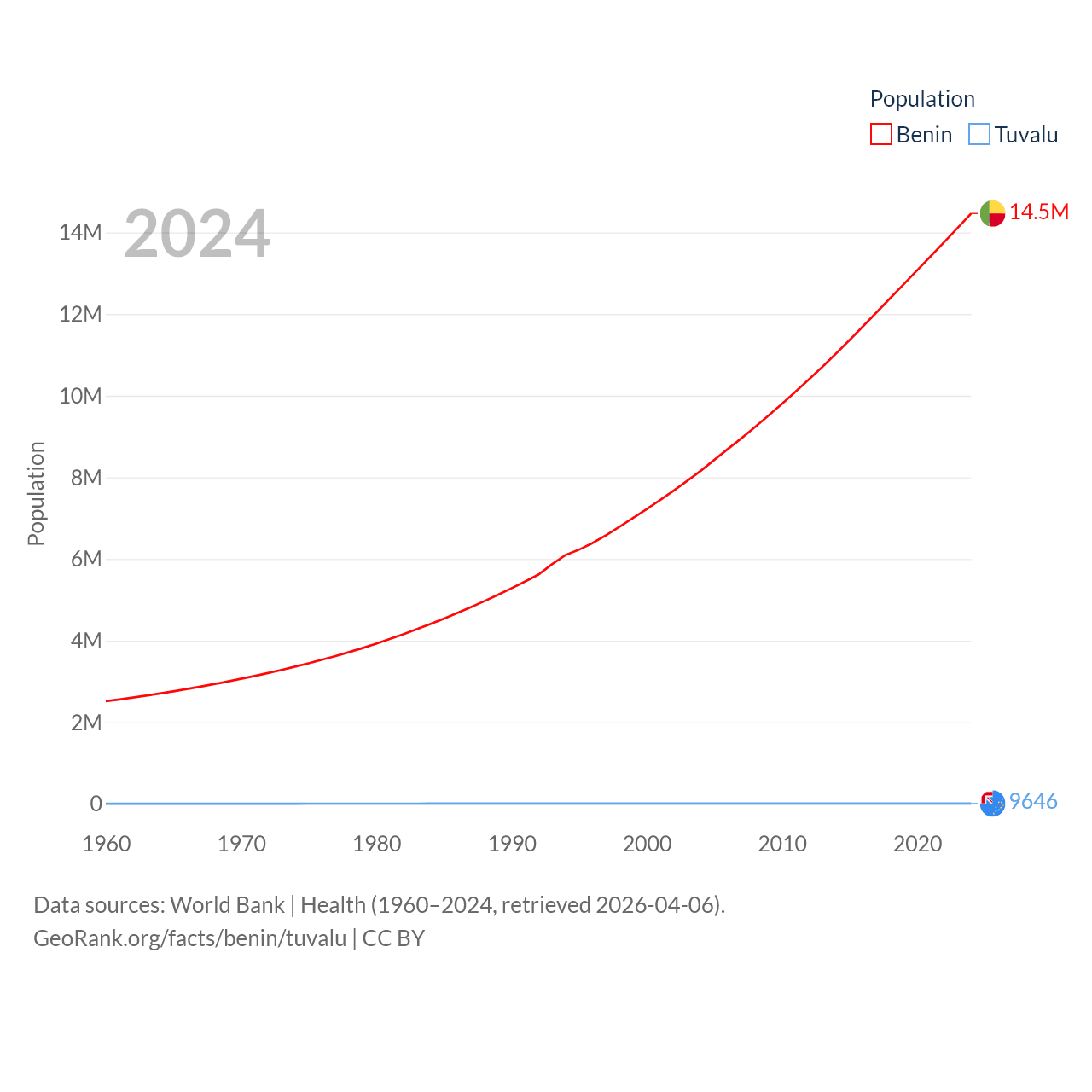 Benin has a population of 14.5M (ranked 76/197), compared with 9.65K in Tuvalu (ranked 196/197). Benin's land area is 43,537 sq mi versus 11.6 sq mi for Tuvalu (ranked 99th vs. 194th).