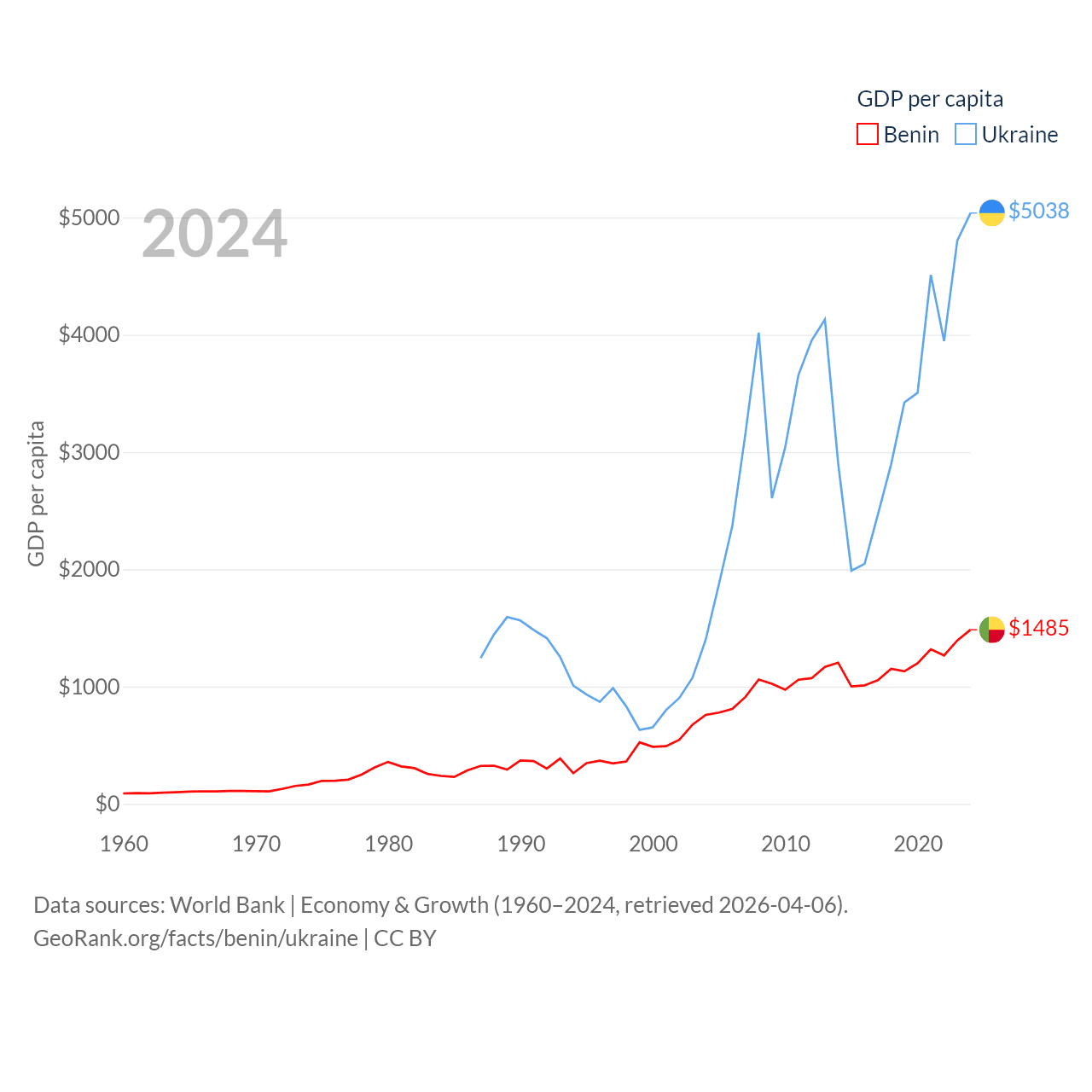 By GDP, Benin ranks 126/197 ($21.5B) and Ukraine ranks 57/197 ($191B). By GDP per capita, Benin ranks 162/197 ($1,485), while Ukraine ranks 120/197 ($5,038).