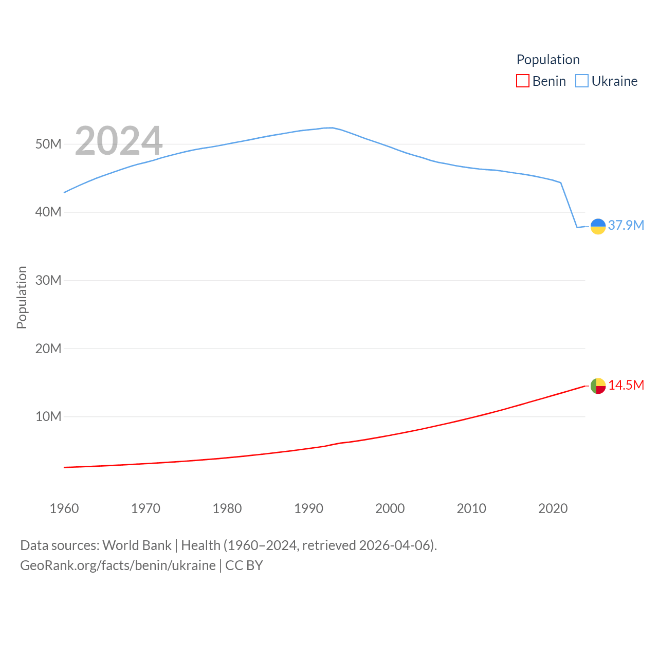 Benin has a population of 14.5M (ranked 76/197), compared with 37.9M in Ukraine (ranked 41/197). Benin's land area is 43,537 sq mi versus 223,708 sq mi for Ukraine (ranked 99th vs. 46th).