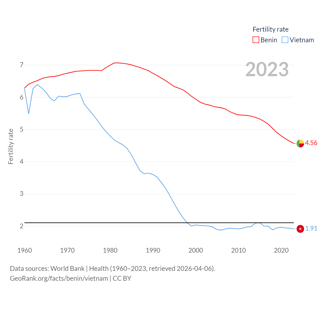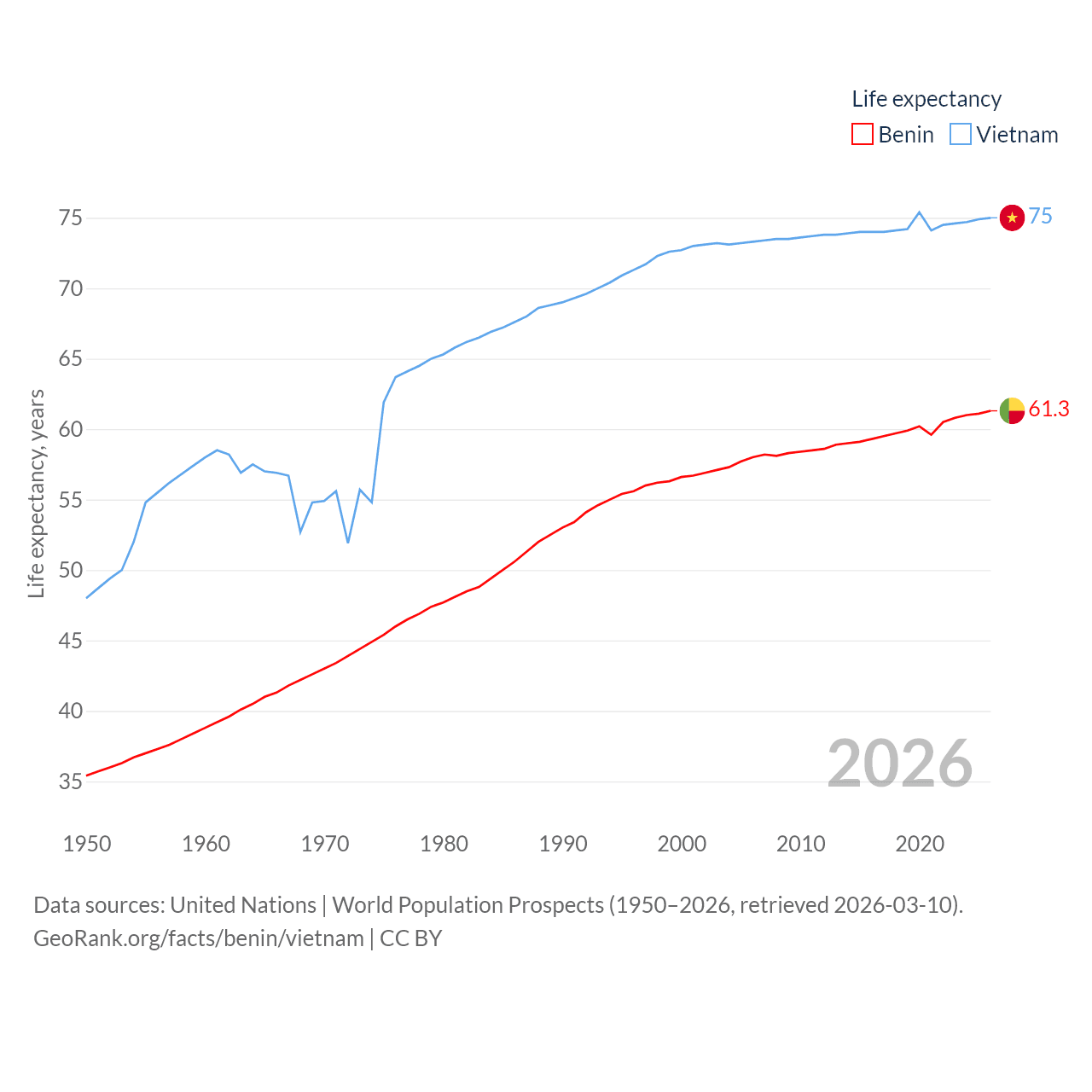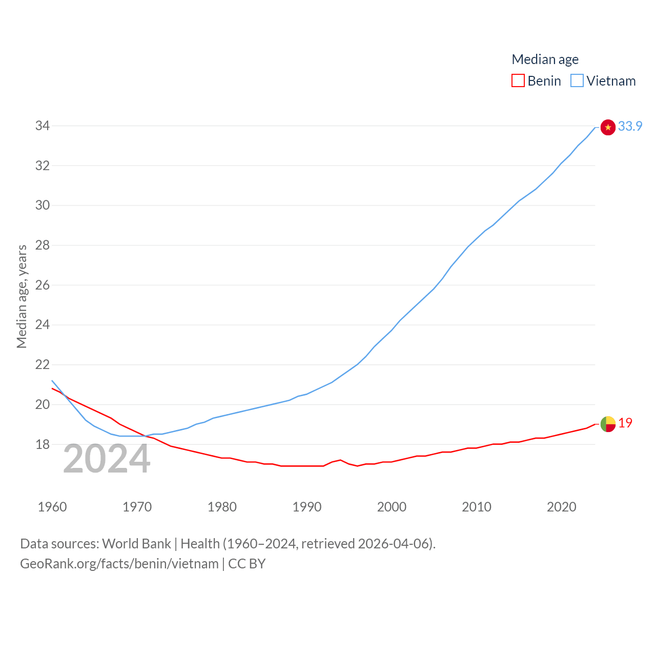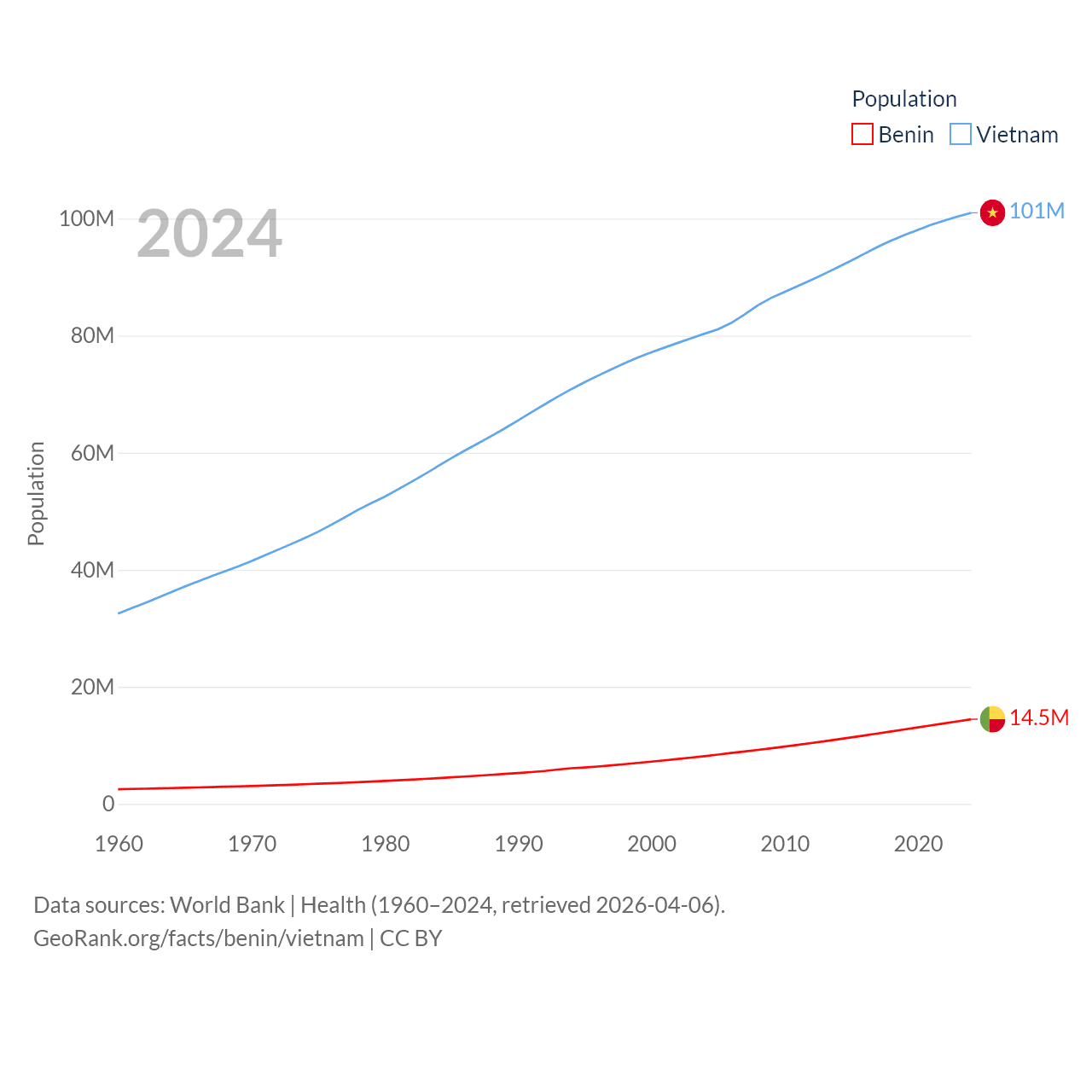 Benin has a population of 14.5M (ranked 76/197), compared with 101M in Vietnam (ranked 16/197). Benin's land area is 43,537 sq mi versus 121,016 sq mi for Vietnam (ranked 99th vs. 67th).
