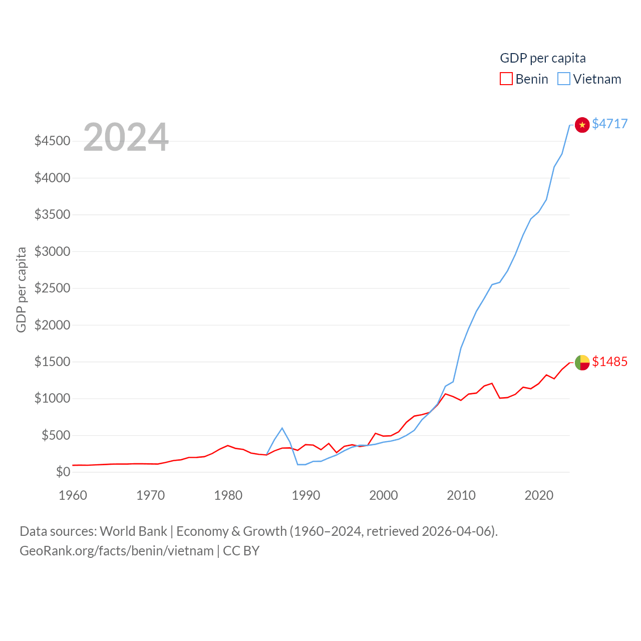 By GDP, Benin ranks 126/197 ($21.5B) and Vietnam ranks 33/197 ($476B). By GDP per capita, Benin ranks 162/197 ($1,485), while Vietnam ranks 122/197 ($4,717).