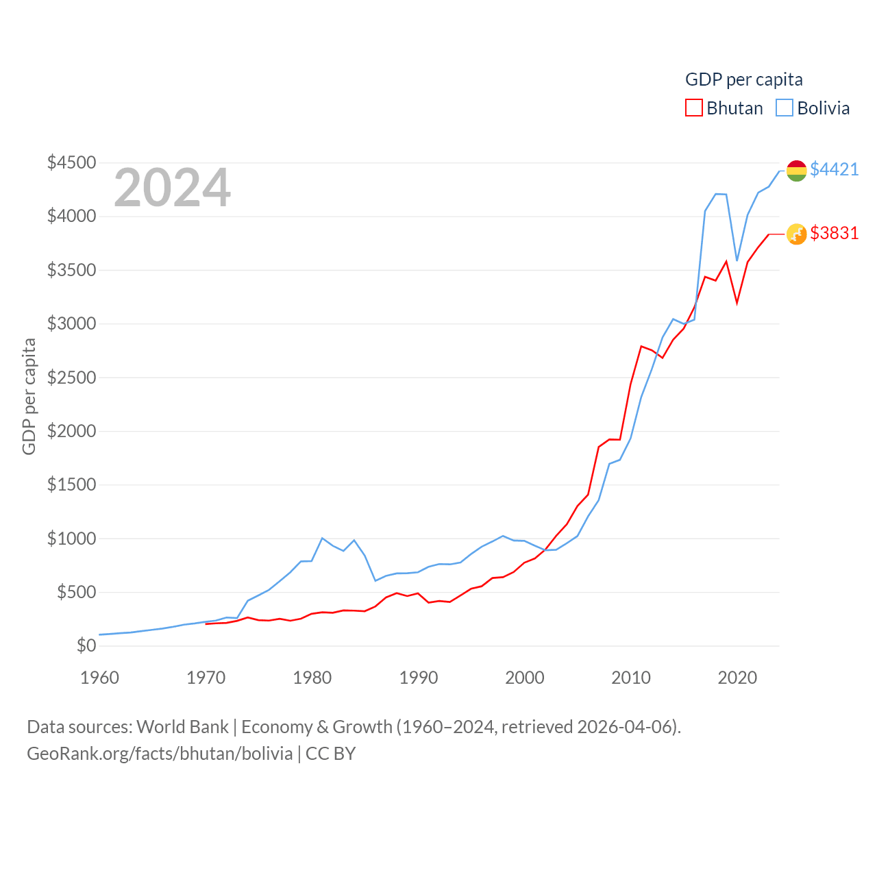 By GDP, Bhutan ranks 170/197 ($3.01B) and Bolivia ranks 88/197 ($54.9B). By GDP per capita, Bhutan ranks 132/197 ($3,831), while Bolivia ranks 125/197 ($4,421).