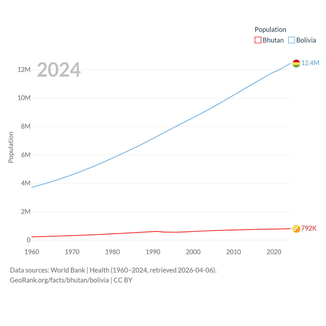Bhutan has a population of 792K (ranked 163/197), compared with 12.4M in Bolivia (ranked 79/197). Bhutan's land area is 14,726 sq mi versus 418,264 sq mi for Bolivia (ranked 132nd vs. 27th).