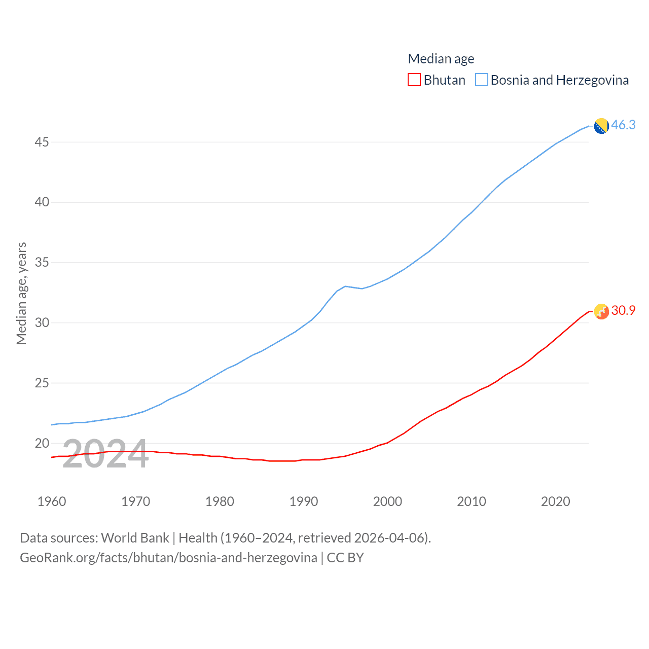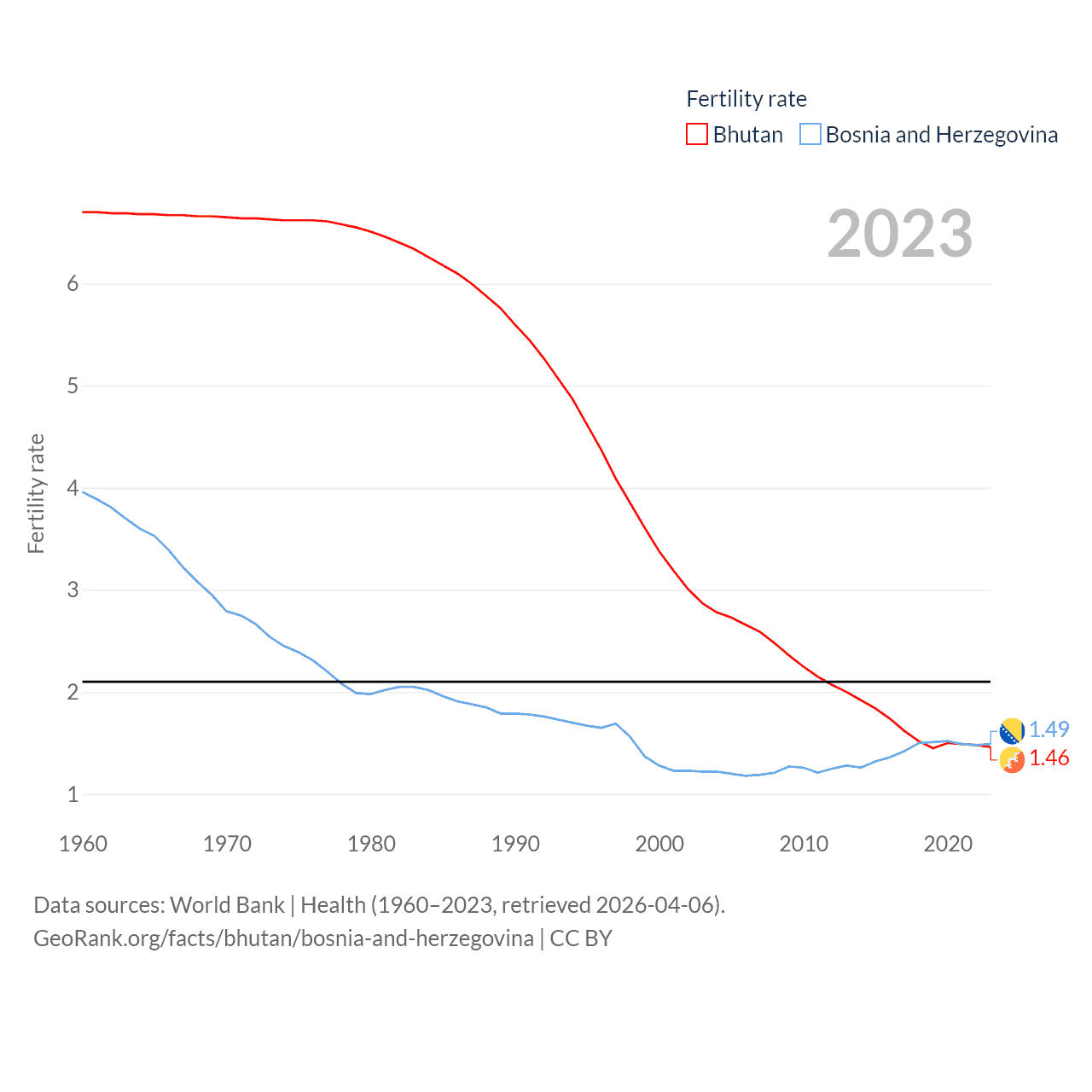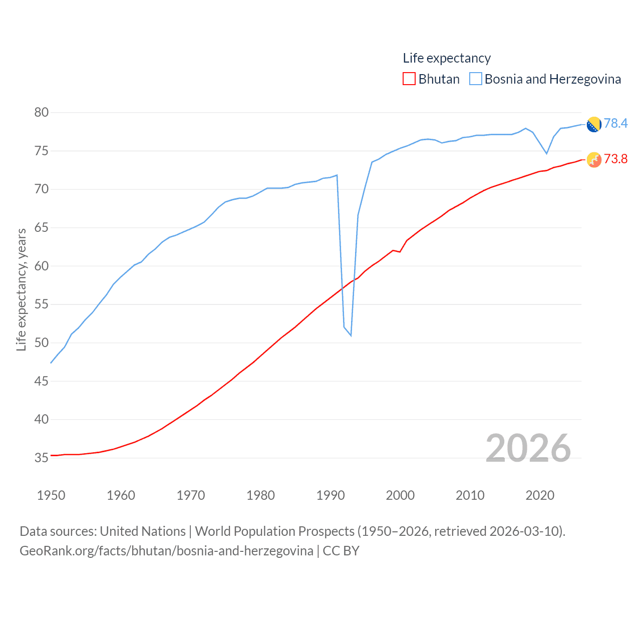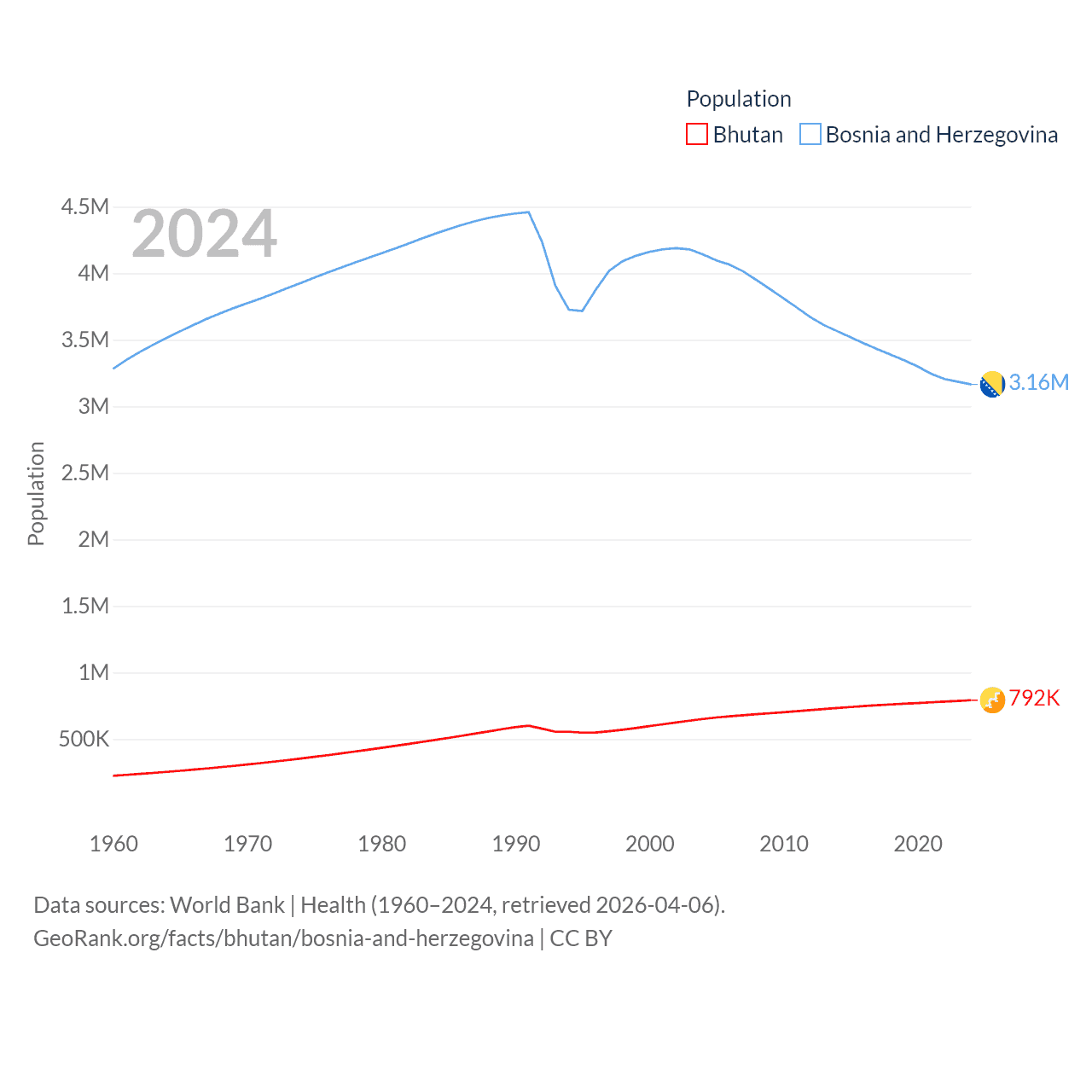 Bhutan has a population of 792K (ranked 163/197), compared with 3.16M in Bosnia and Herzegovina (ranked 134/197). Bhutan's land area is 14,726 sq mi versus 19,768 sq mi for Bosnia and Herzegovina (ranked 132nd vs. 125th).