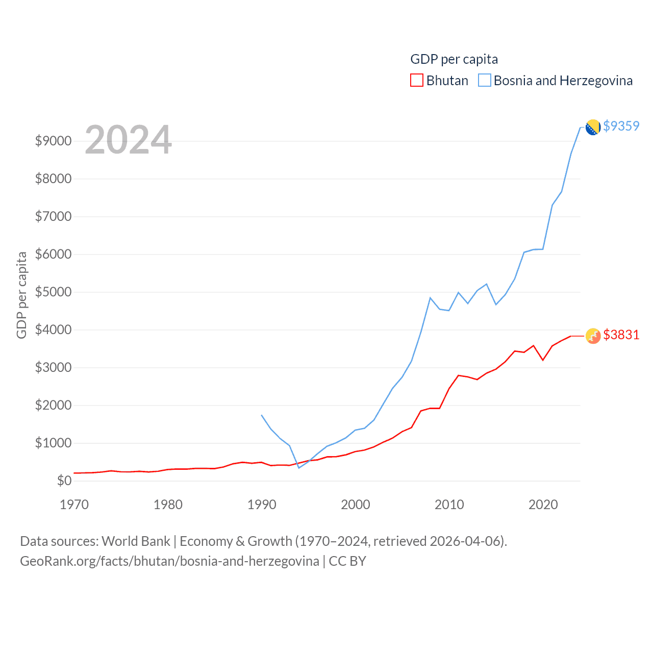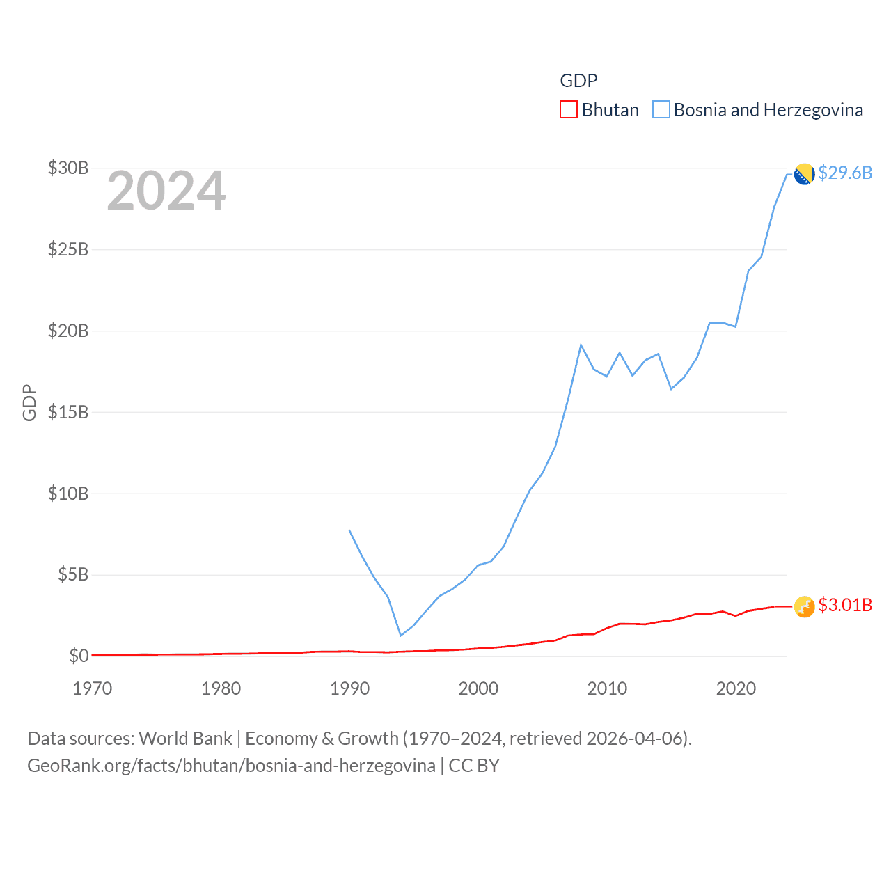 By GDP, Bhutan ranks 170/197 ($3.01B) and Bosnia and Herzegovina ranks 111/197 ($29.6B). By GDP per capita, Bhutan ranks 132/197 ($3,831), while Bosnia and Herzegovina ranks 87/197 ($9,359).