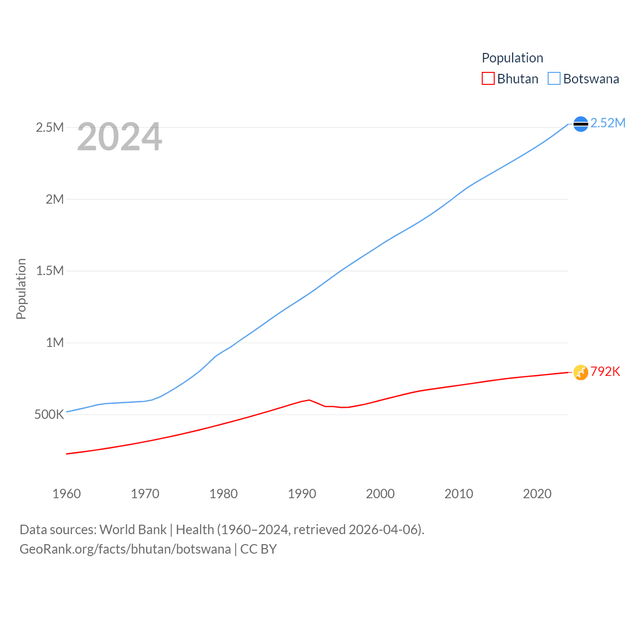 Bhutan has a population of 792K (ranked 163/197), compared with 2.52M in Botswana (ranked 142/197). Bhutan's land area is 14,726 sq mi versus 218,816 sq mi for Botswana (ranked 132nd vs. 47th).