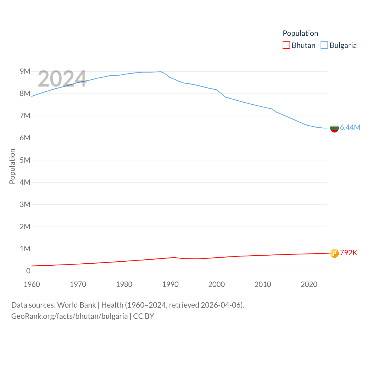 Bhutan has a population of 792K (ranked 163/197), compared with 6.44M in Bulgaria (ranked 110/197). Bhutan's land area is 14,726 sq mi versus 41,915 sq mi for Bulgaria (ranked 132nd vs. 101st).