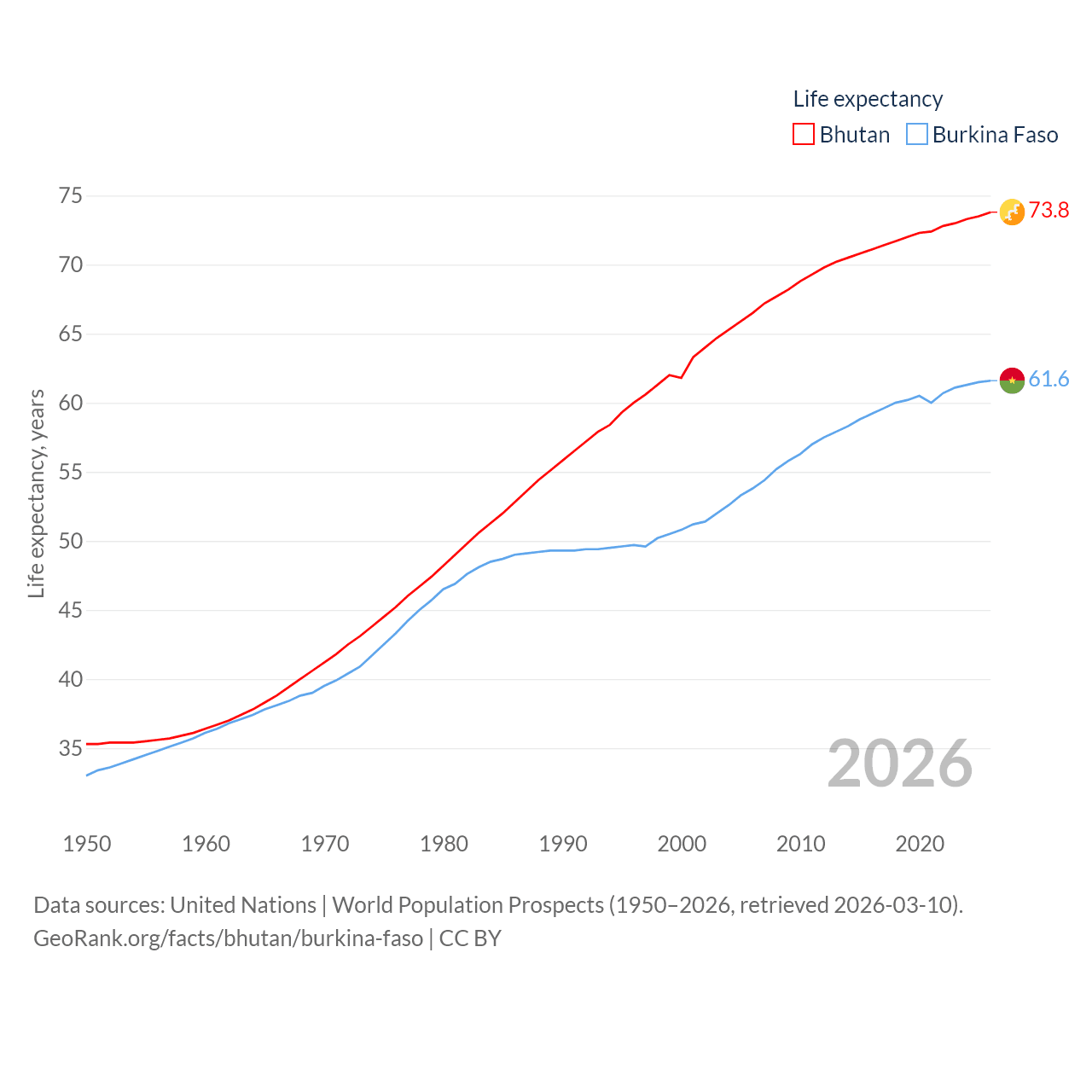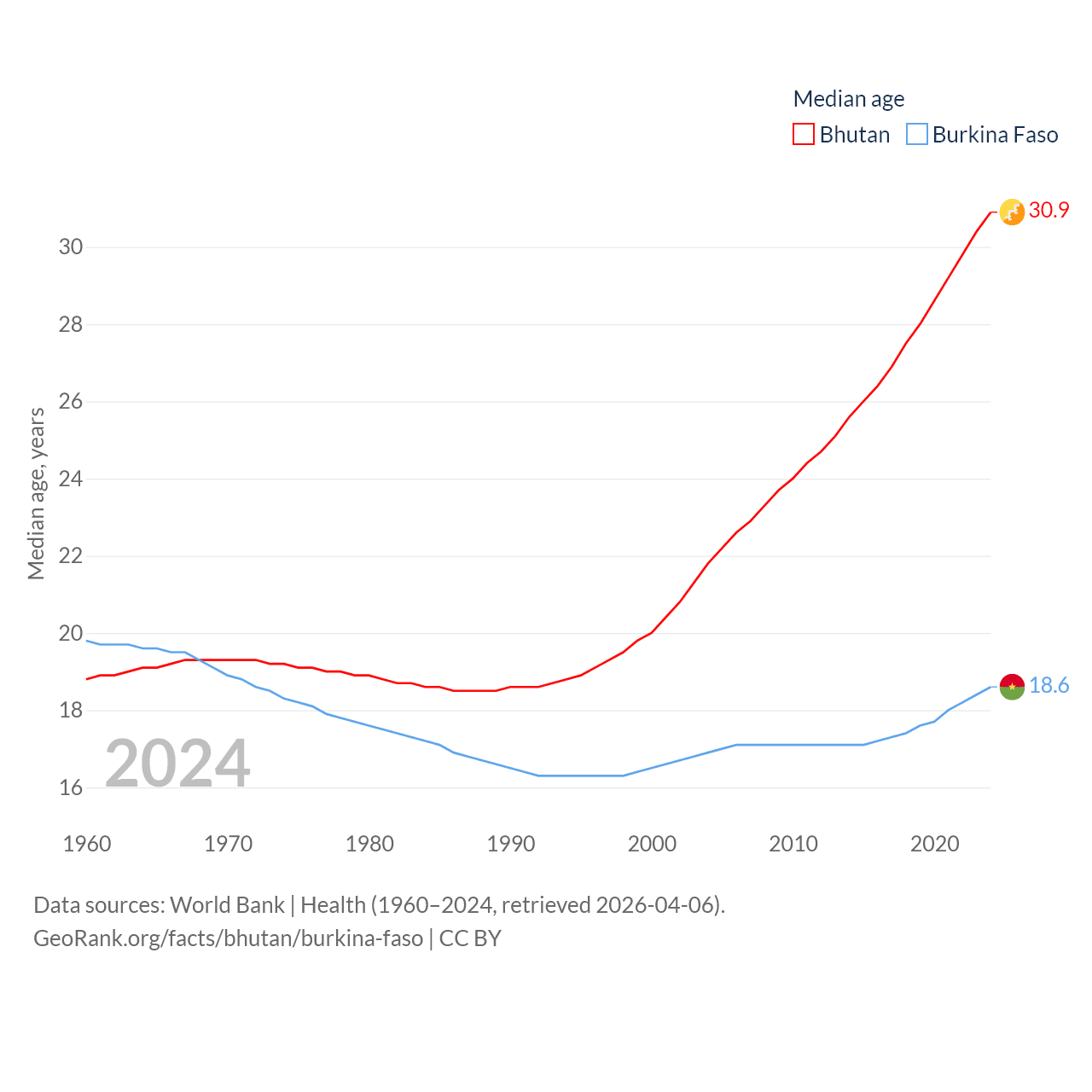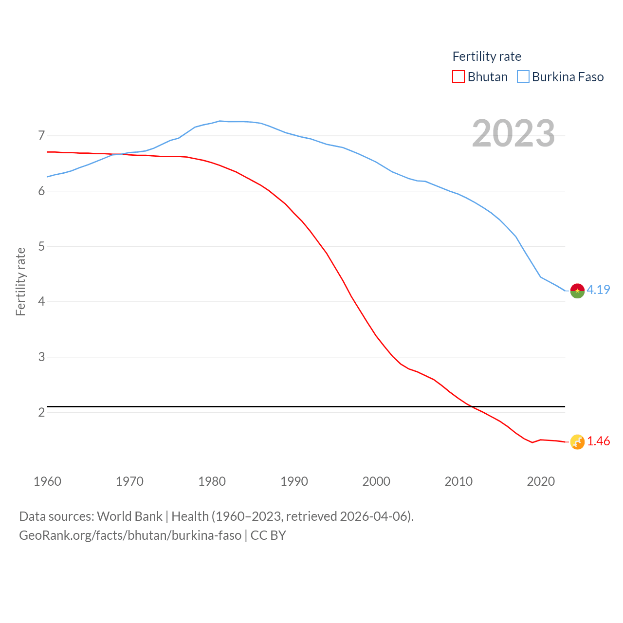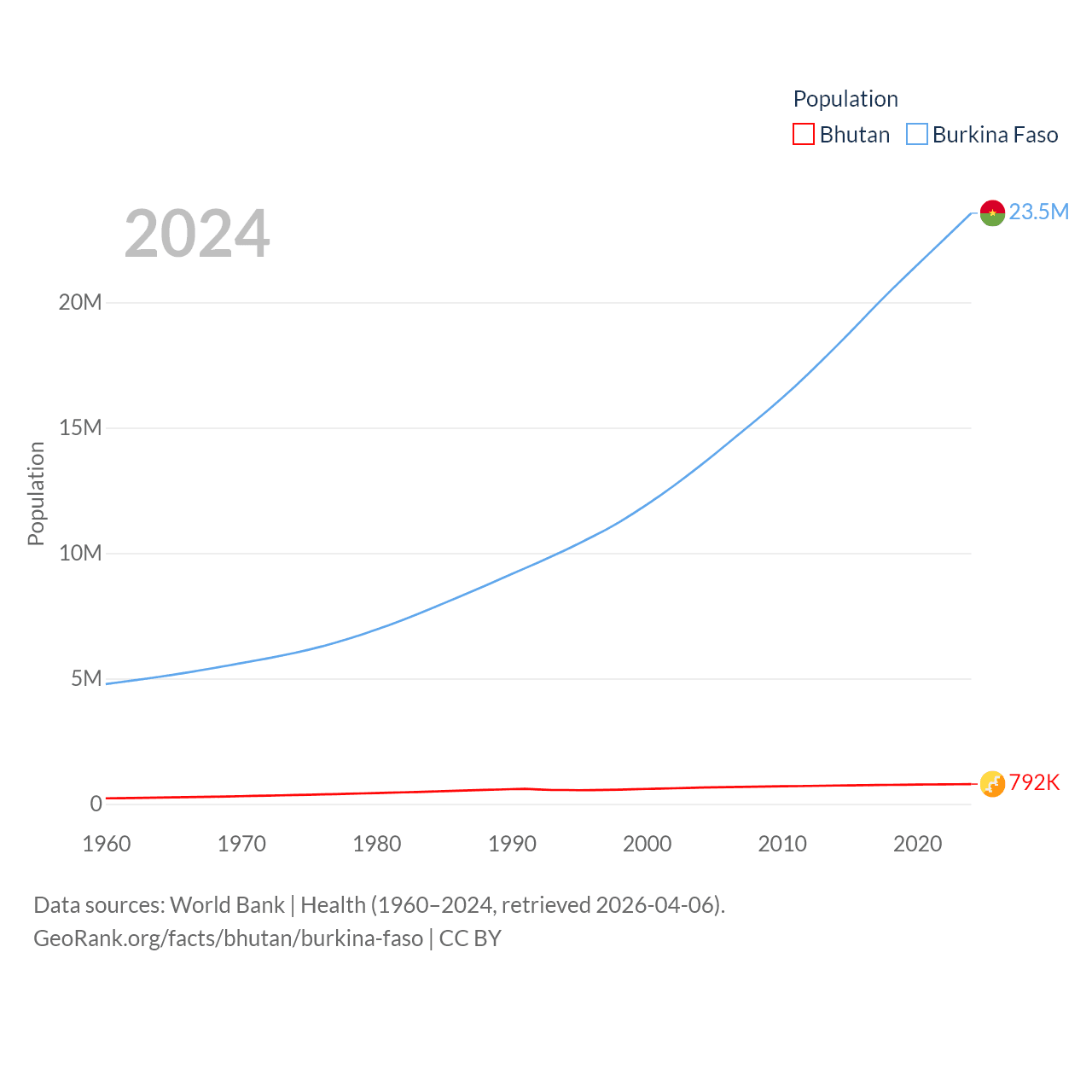 Bhutan has a population of 792K (ranked 163/197), compared with 23.5M in Burkina Faso (ranked 59/197). Bhutan's land area is 14,726 sq mi versus 105,638 sq mi for Burkina Faso (ranked 132nd vs. 73rd).