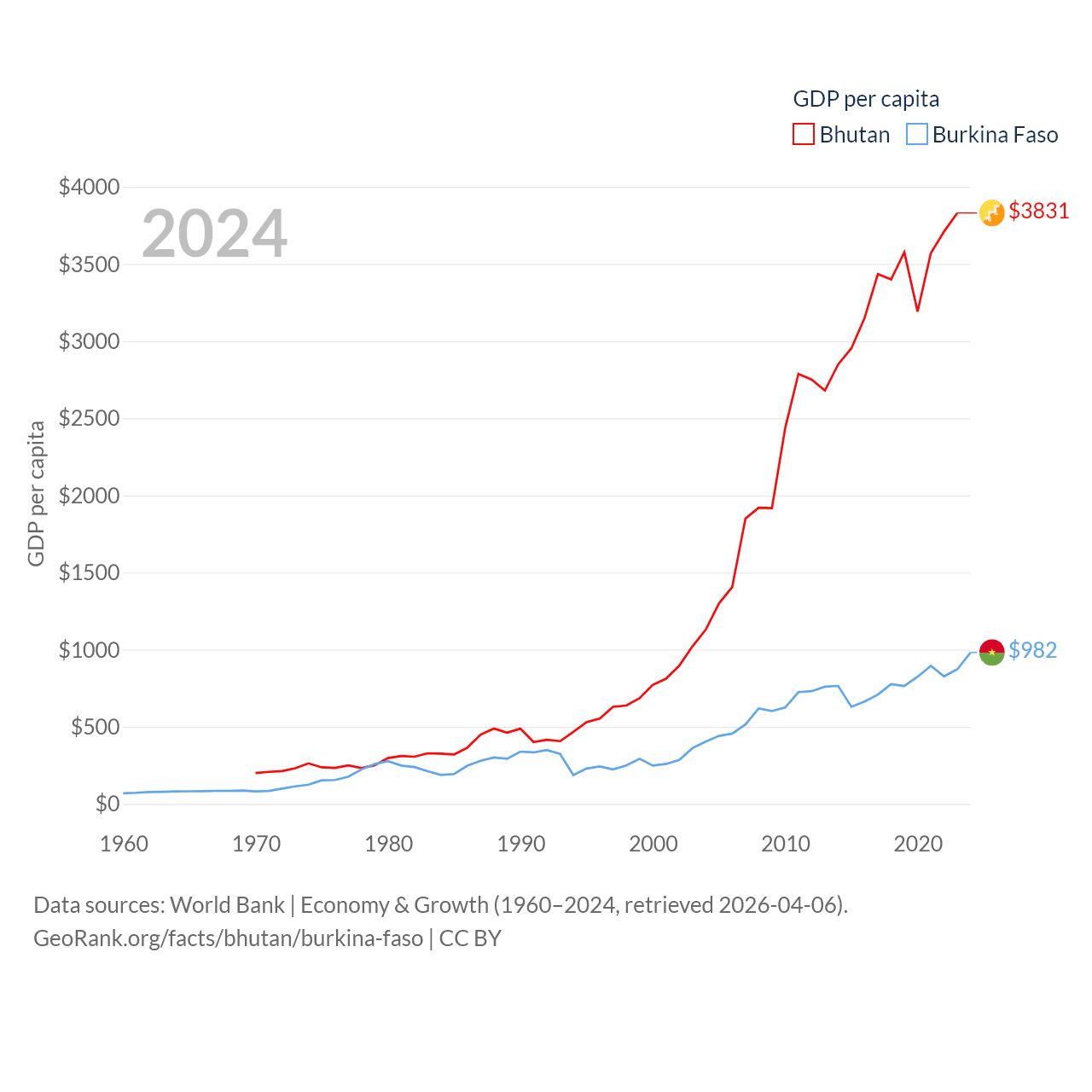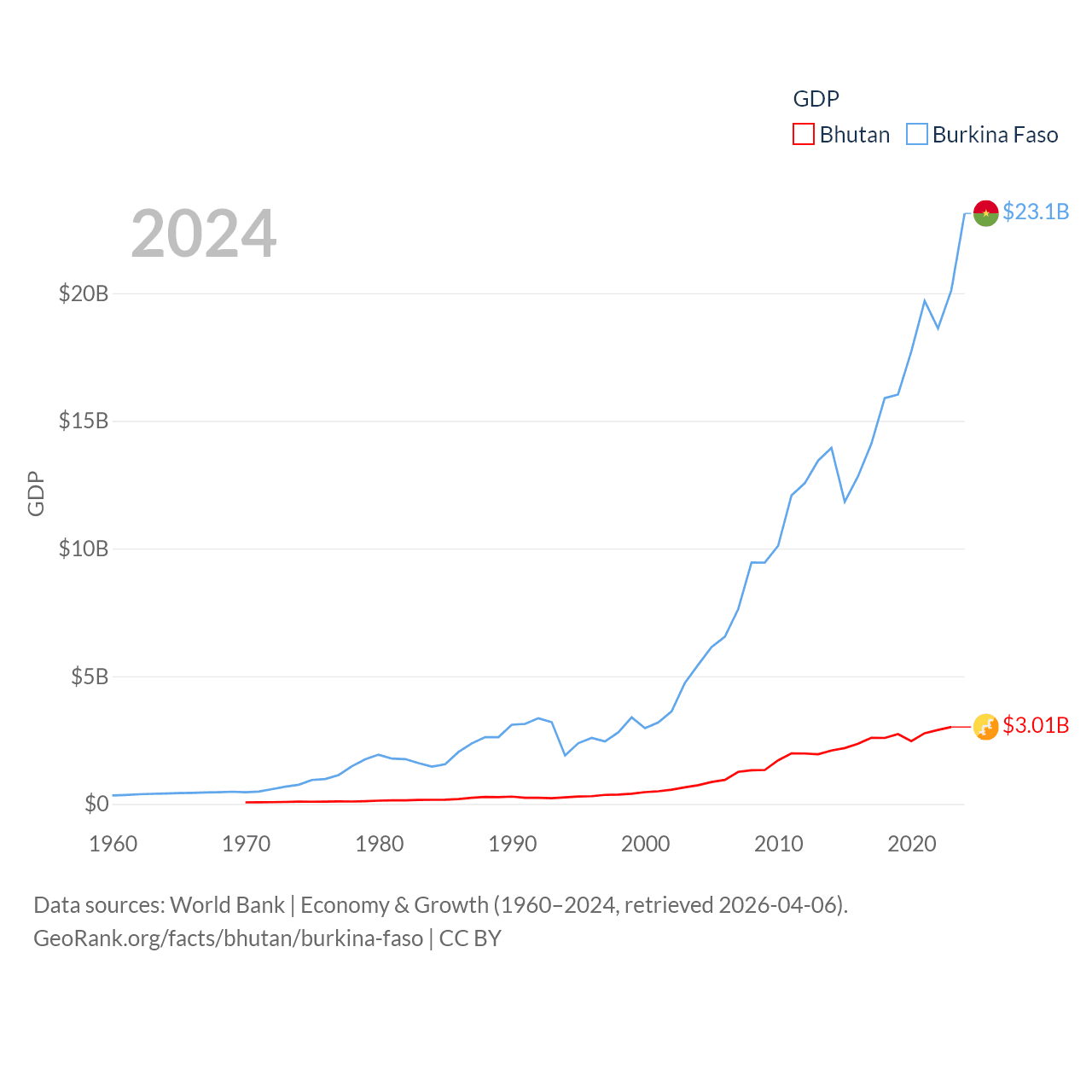 By GDP, Bhutan ranks 170/197 ($3.01B) and Burkina Faso ranks 122/197 ($23.1B). By GDP per capita, Bhutan ranks 132/197 ($3,831), while Burkina Faso ranks 180/197 ($982).