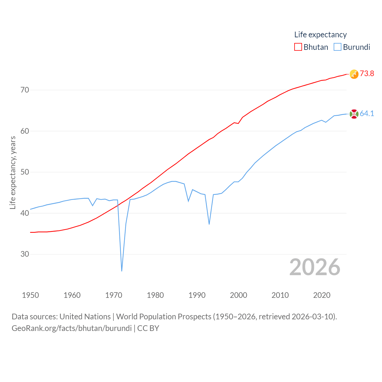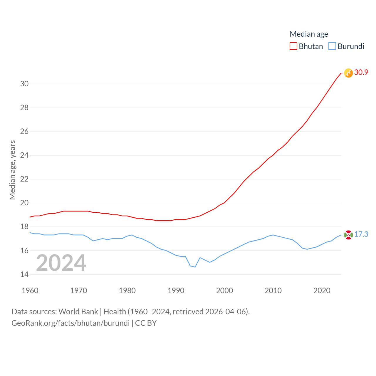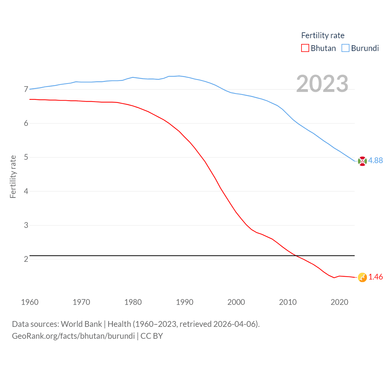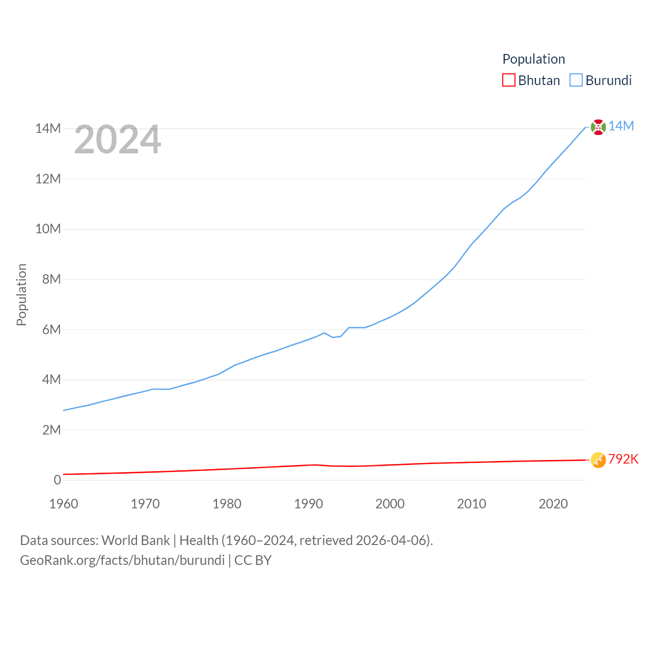 Bhutan has a population of 792K (ranked 163/197), compared with 14M in Burundi (ranked 78/197). Bhutan's land area is 14,726 sq mi versus 9,915 sq mi for Burundi (ranked 132nd vs. 144th).