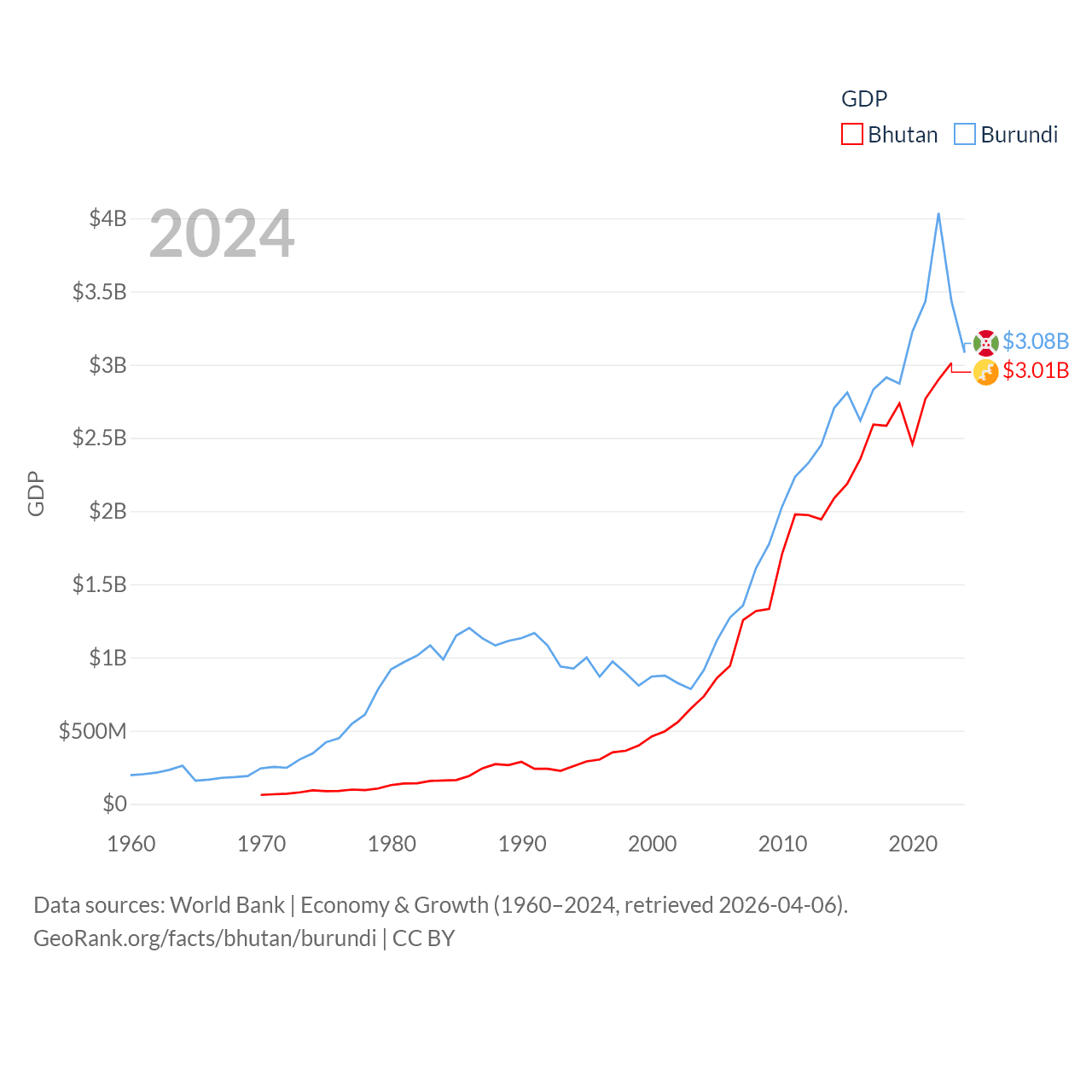 By GDP, Bhutan ranks 170/197 ($3.01B) and Burundi ranks 169/197 ($3.08B). By GDP per capita, Bhutan ranks 132/197 ($3,831), while Burundi ranks 197/197 ($219.4).