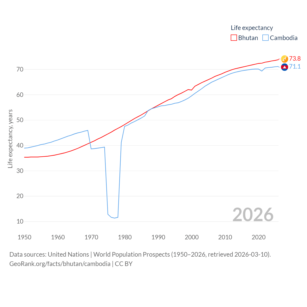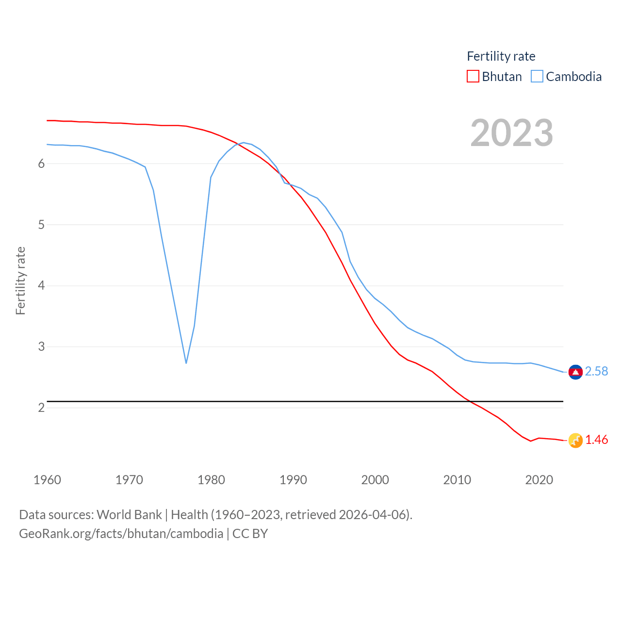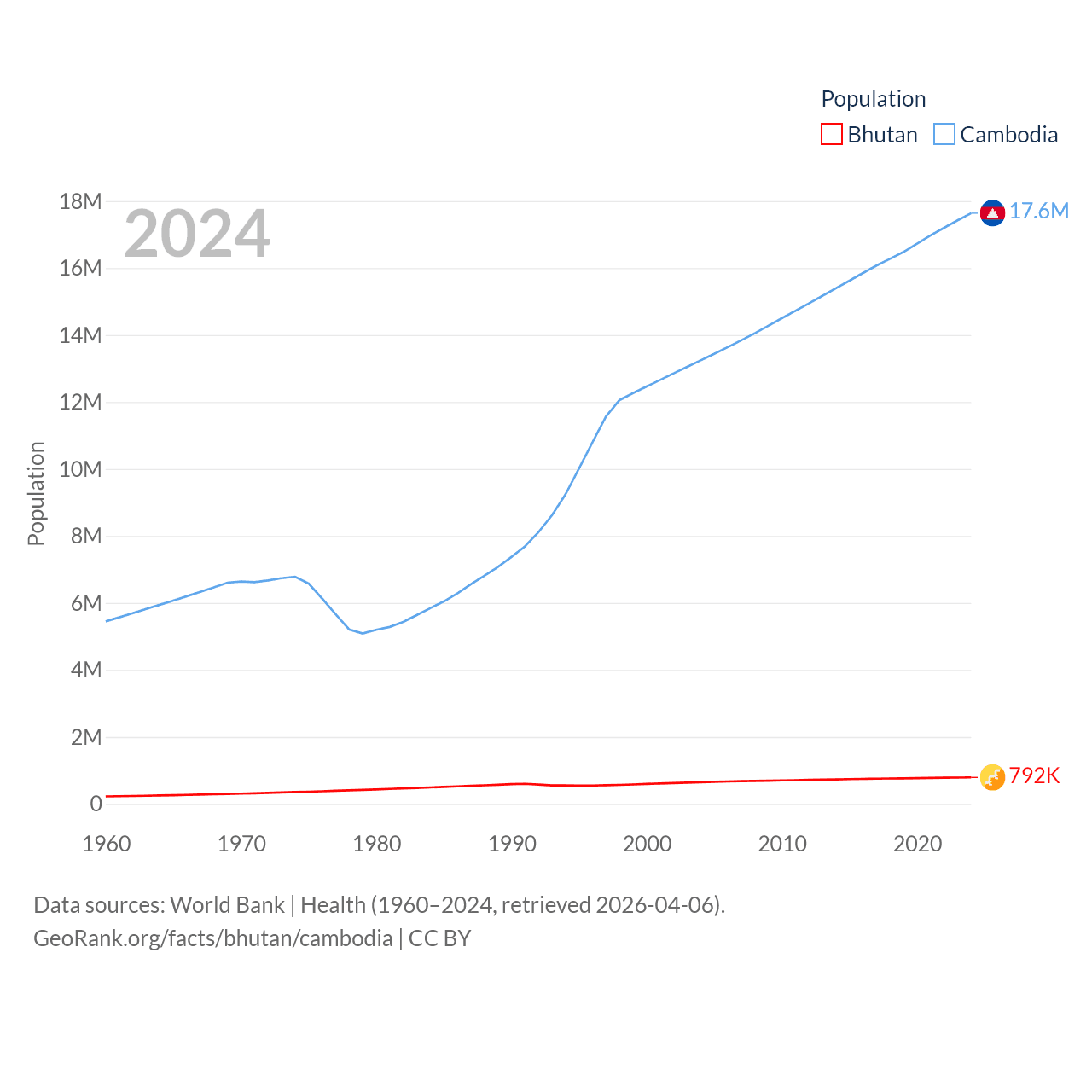 Bhutan has a population of 792K (ranked 163/197), compared with 17.6M in Cambodia (ranked 73/197). Bhutan's land area is 14,726 sq mi versus 68,155 sq mi for Cambodia (ranked 132nd vs. 88th).